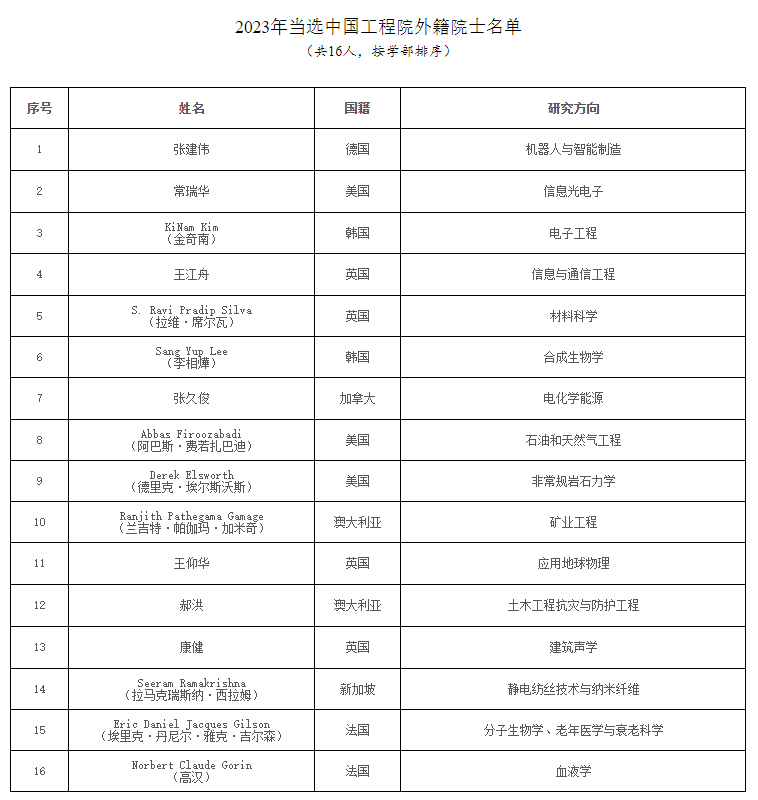 中国工程院2023年外籍院士增选共选举产生16位中国工程院外籍院士。