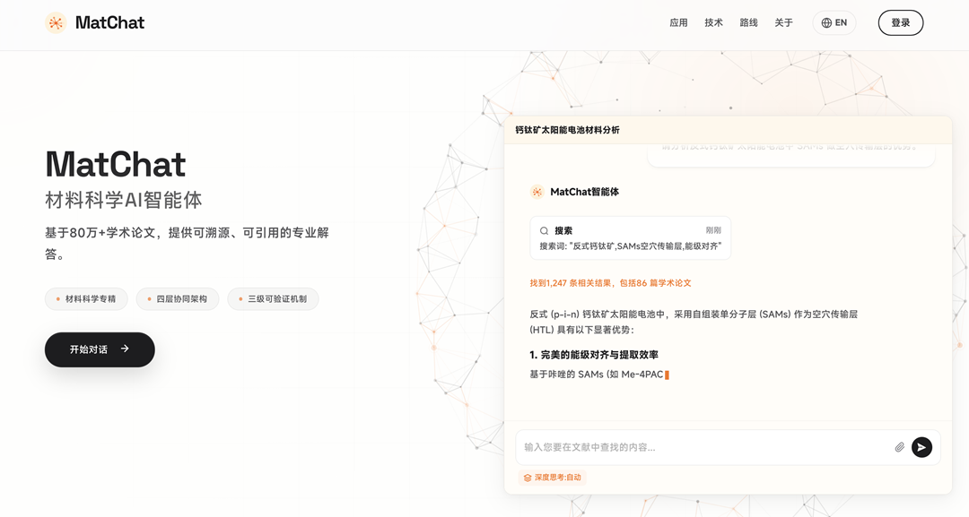 近日,中国科学院东莞材料科学与技术研究所(下称“东莞材料所”)发布国内首个专注于材料科学领域的AI智能体升级版MatChat 2.0。该产品基于80万篇权威学术论文构建,在知识库规模、推理能力等多维度实现升级,更以1.3%的超低幻觉率大幅优于多款主流大模型,为材料科学研究打造了全新的智能研究范式。