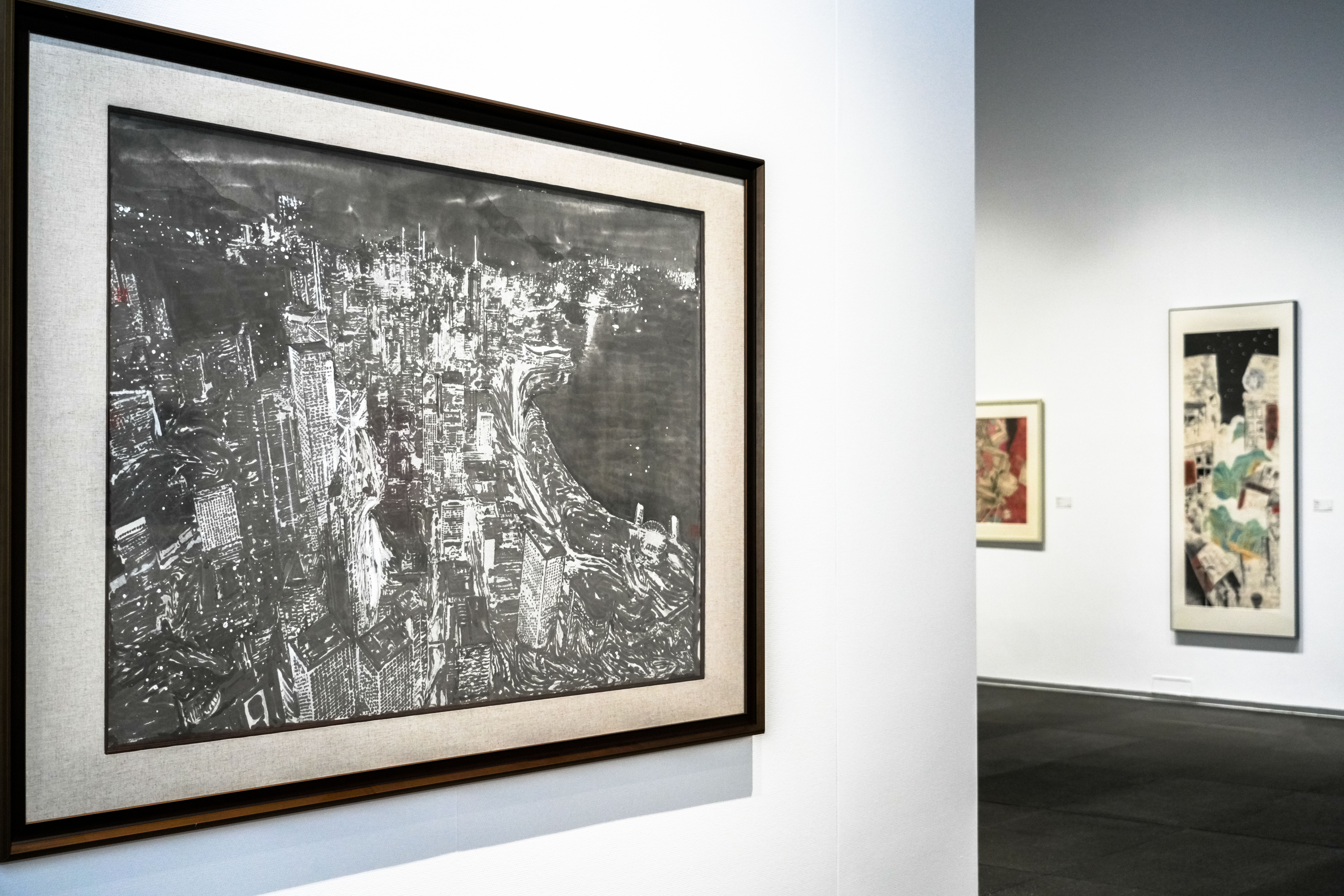 展览以时间为经,以作品为纬,将半个世纪的典藏娓娓道来。从建馆初期对传统水墨的引进,到上世纪90年代“现代水墨”概念的浮现,再到新世纪以来“城市山水”“都市水墨”等学术理念的深耕,每一阶段都有代表性作品与之呼应。但展览并未止步于线性叙事,而是巧妙地设置了一条“文献检索”线索:每一年份对应一个二维码,观众可以随手查阅策展人梳理的当年国内外水墨大事,在作品与历史的互文中,立体感知新世纪水墨的演变轨迹。