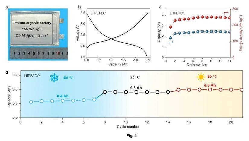 基于此材料,团队制备出一款能量密度超过250瓦时/公斤的有机软包电池。这一数值已超越目前广泛使用的磷酸铁锂电池,且该电池展现出卓越的温度适应能力,不仅能在-70℃到80℃的极端温度下正常工作,还兼具良好的柔韧性与安全性,为未来电池设定了高性能与高安全兼顾的新标准。