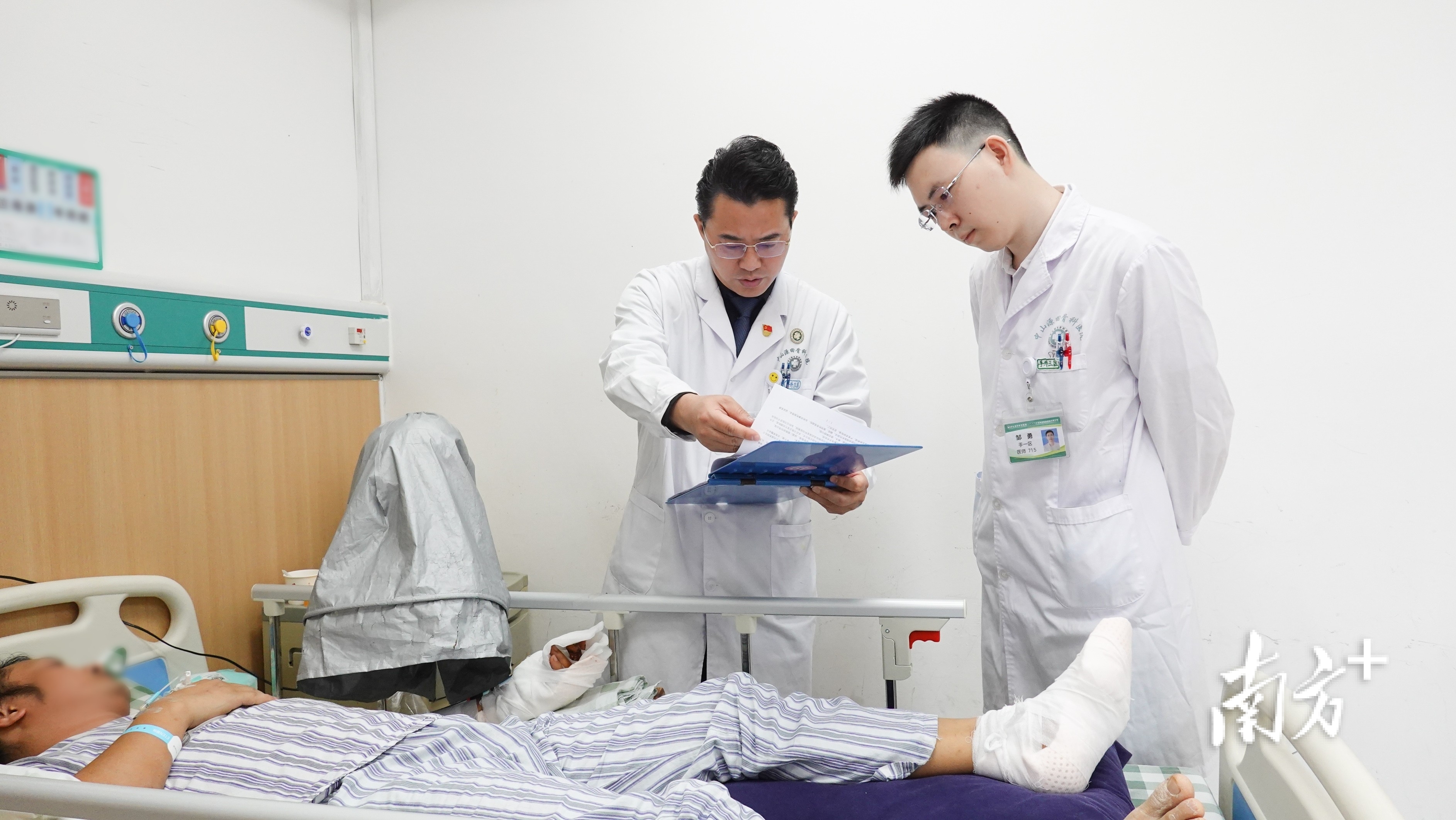 曾艺平与团队成员查看患者恢复情况。