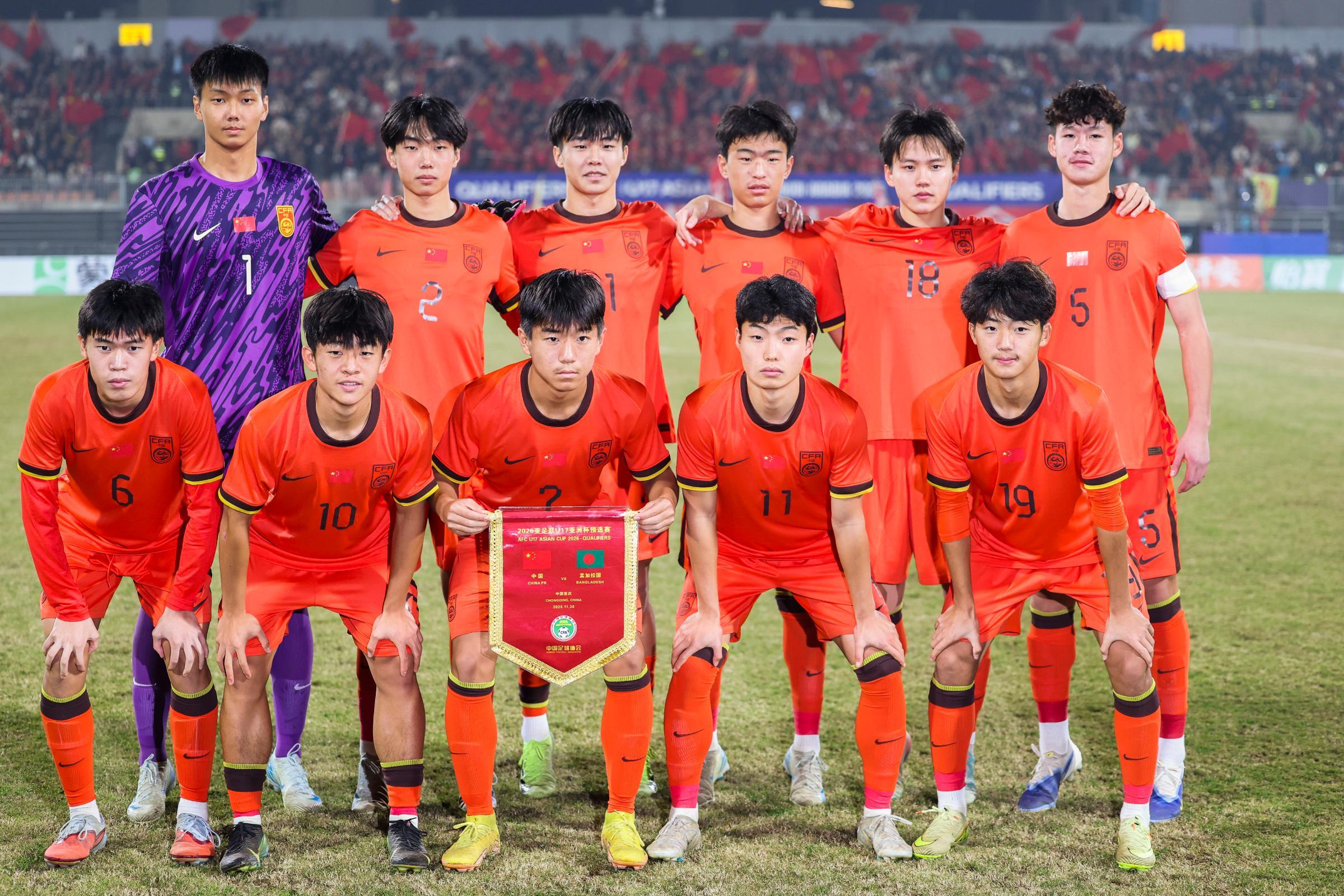 2025年11月30日,中国队4比0战胜孟加拉国队,成功获得2026年U17亚洲杯决赛阶段的比赛资格。图为中国队首发球员在赛前合影。