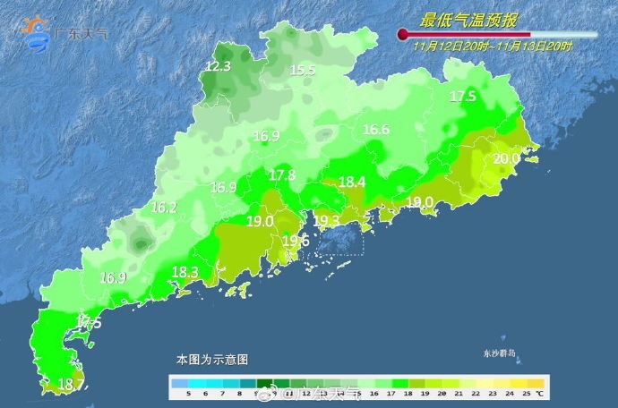 具体天气预报为,12-13日,东部市县多云间阴天,其余大部分市县多云到晴。最低气温:粤北大部、肇庆和云浮北部市县13-16℃,南部沿海市县19-21℃,其余市县16-19℃。