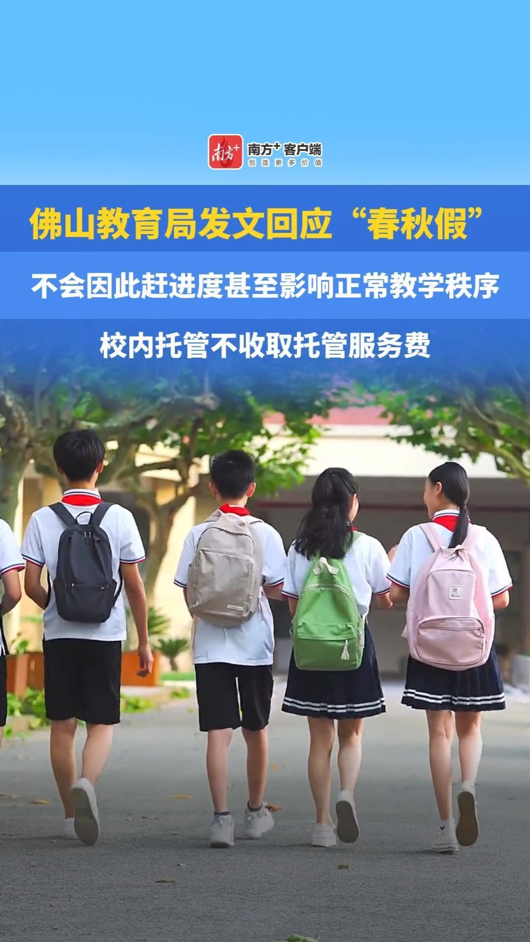 佛山教育局发文回应“春秋假”:不会因此赶进度甚至影响正常教学秩序,校内托管不收取托管服务费