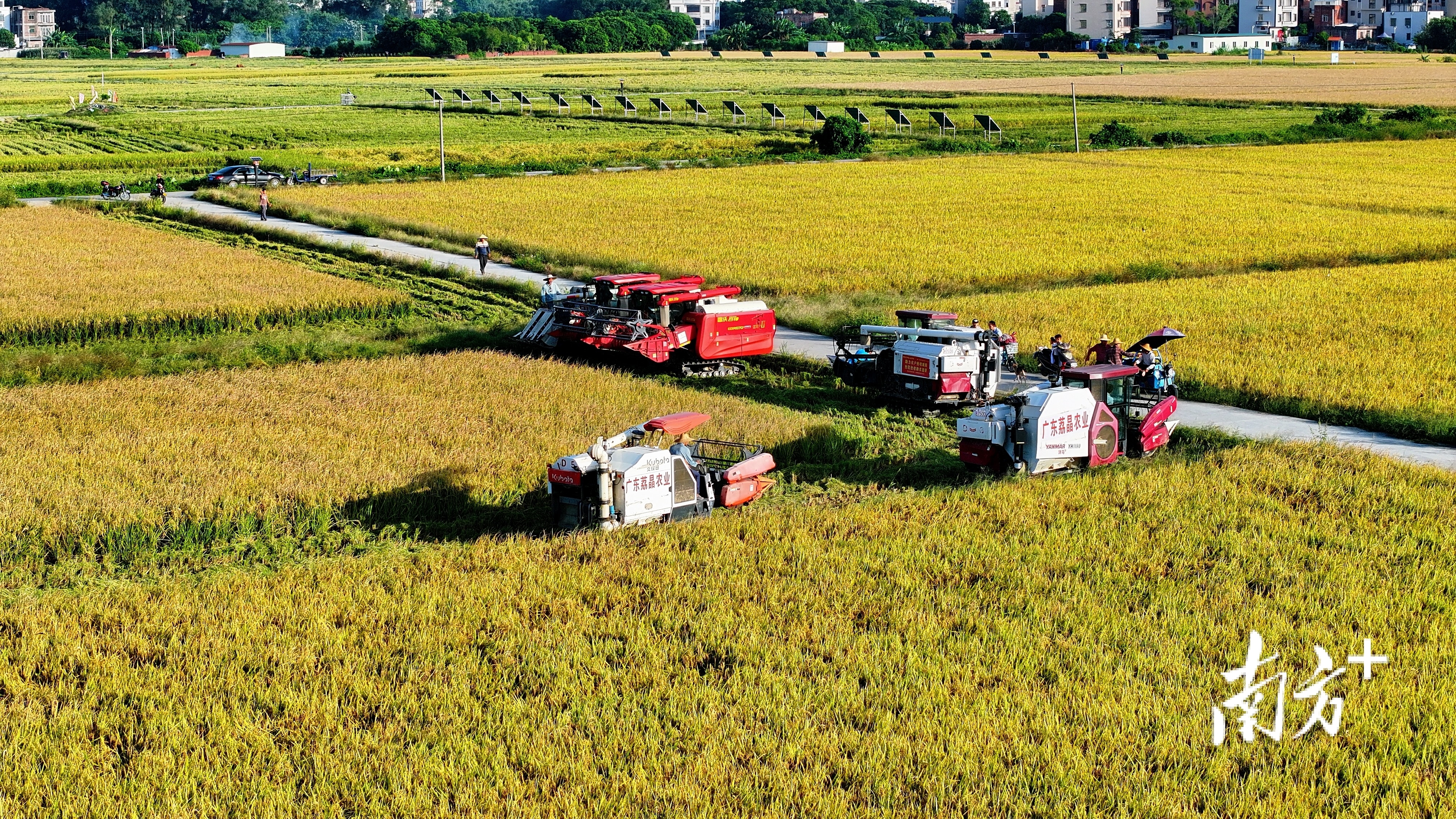 稻浪翻滚,沃野流金。在高州市镇江镇的万亩农田里,红色收割机在齐腰的金黄稻穗间缓缓前行,拉开今年晚稻丰收的序幕。