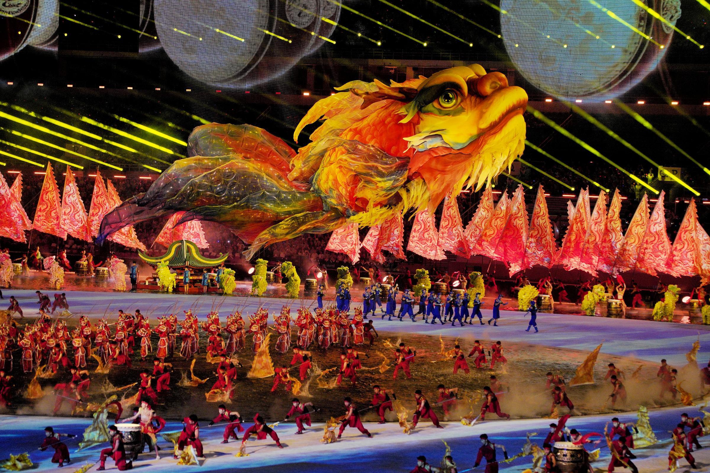 全运会开幕式上,醒狮与VR共舞、英歌舞与全息投影和鸣,技术团队通过光影投影和AR技术营造出9条活灵活现的“龙舟”,英歌舞队员也“变身”龙舟队形,以昂扬舞姿绘就中华民族乘风破浪、百舸争流的激情画卷,展现着“比”的激情。