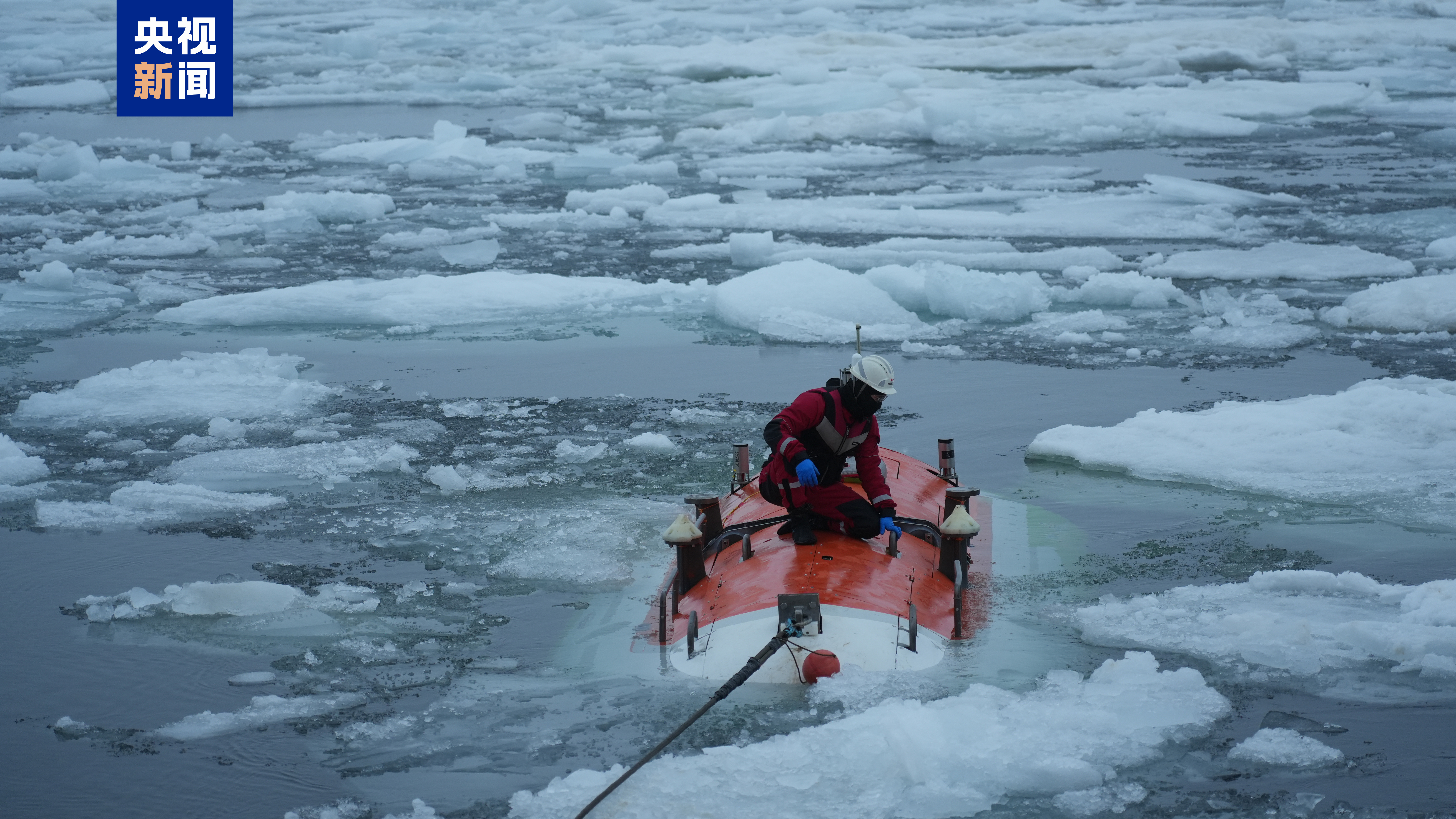 △蛙人在北极密集冰区回收“奋斗者”号。
