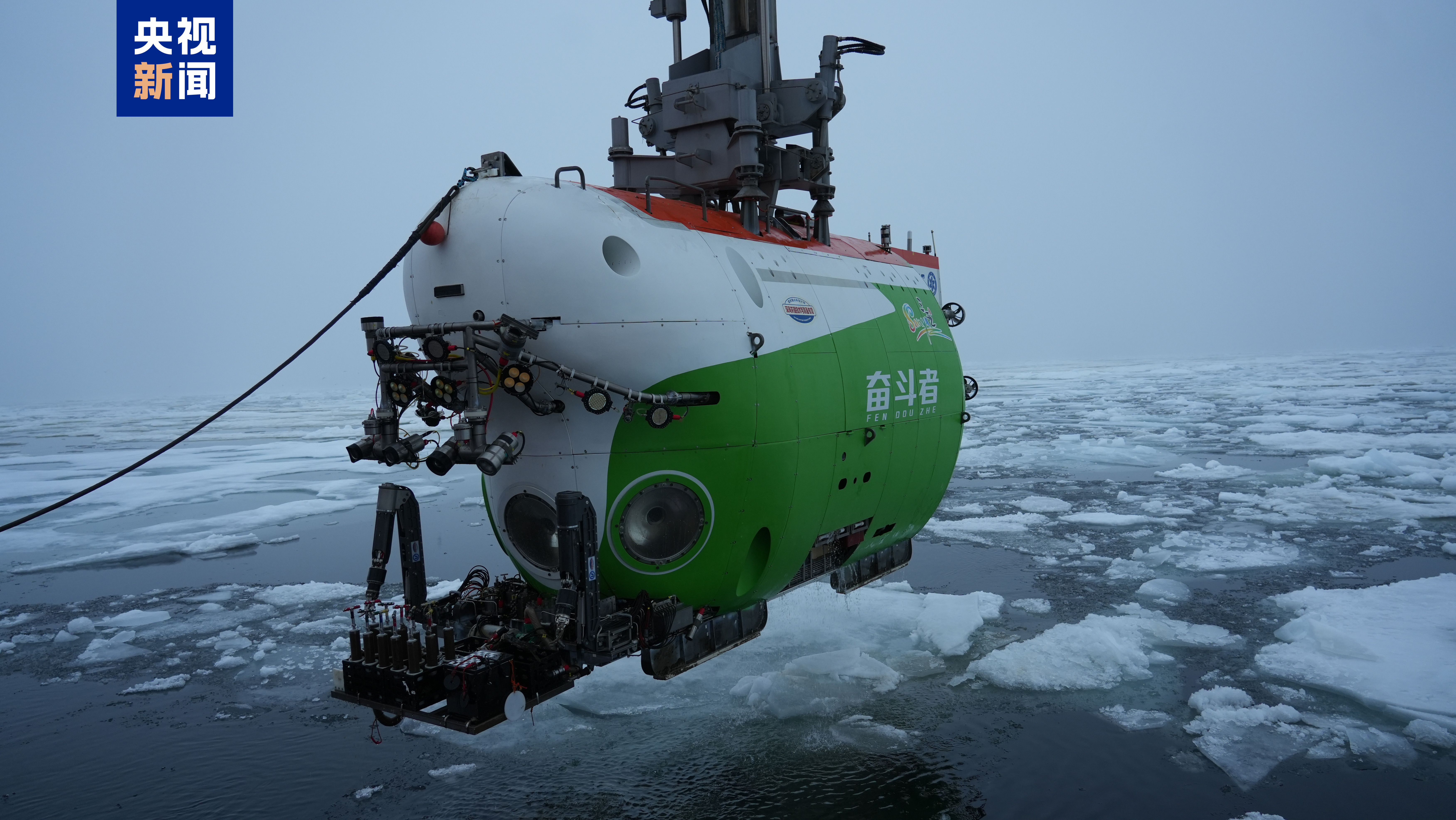 △“奋斗者”号在北极密集冰区回收。