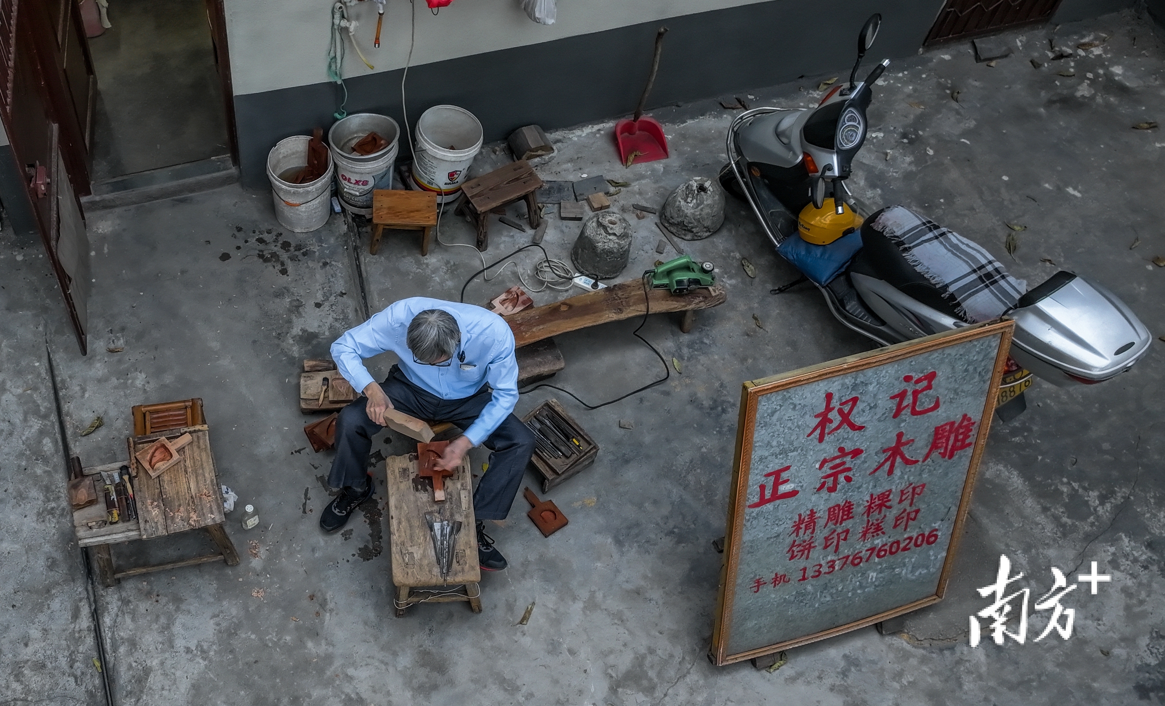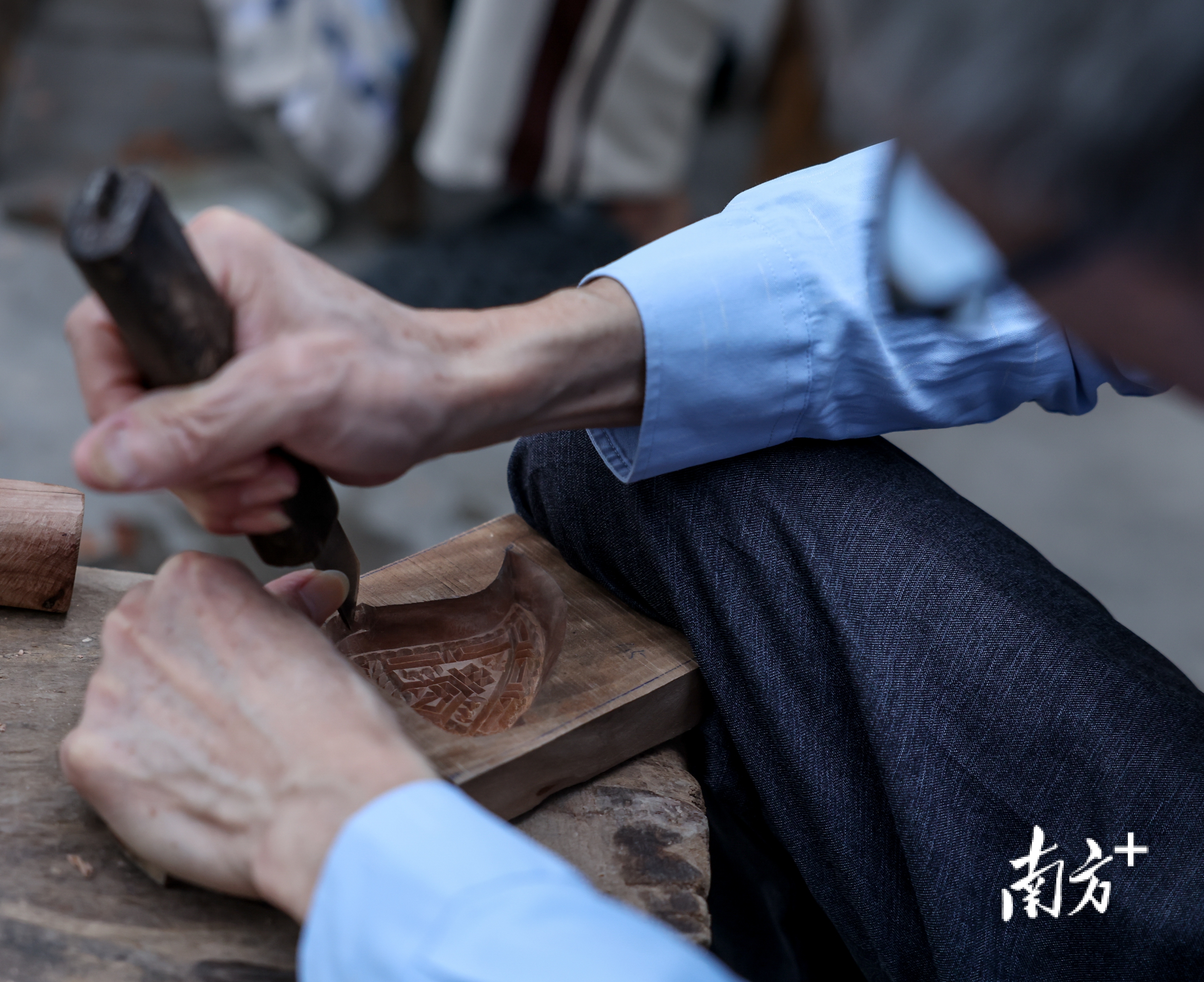 秋日午后,韩江东畔树影婆娑,写着“权记正宗木雕”的招牌旁坐着一位埋头工作的匠人。一手持雕刀、一手握木锤,凿刻声声间,半个世纪悄然流走,在许丽明的见证下,上万个糕、粿、饼印模从这一方小天地制成,流入千家万户。