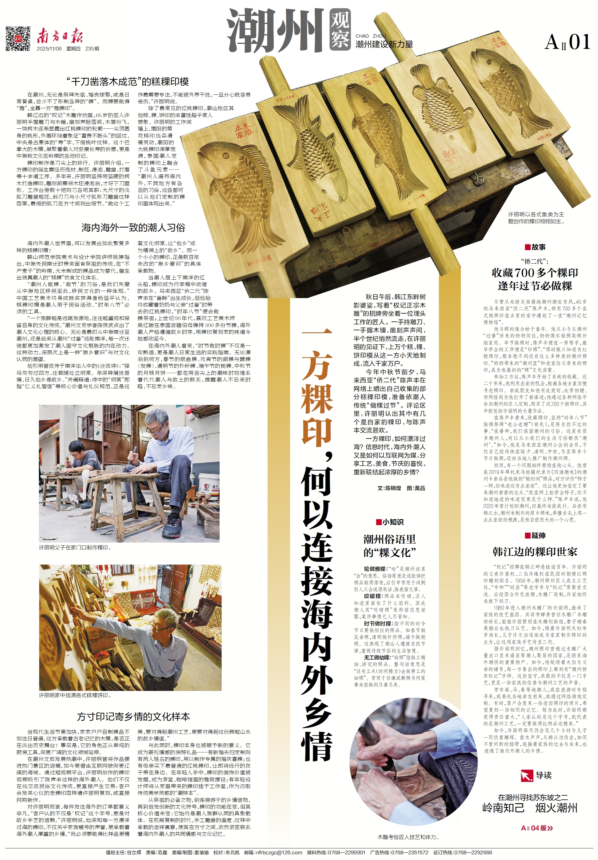 对许丽明而言,每件发往海外的订单都意义非凡。“客户认的不仅是‘权记’这个字号,更是对故乡手艺的信赖。”许丽明说,他深知每一方漂洋过海的粿印,不仅关乎家族铺号的声誉,更承载着海外潮人厚重的乡情,“我必须要做得比样品更精美,要对得起潮州工艺,更要对得起这份跨越山水的故乡情谊。”