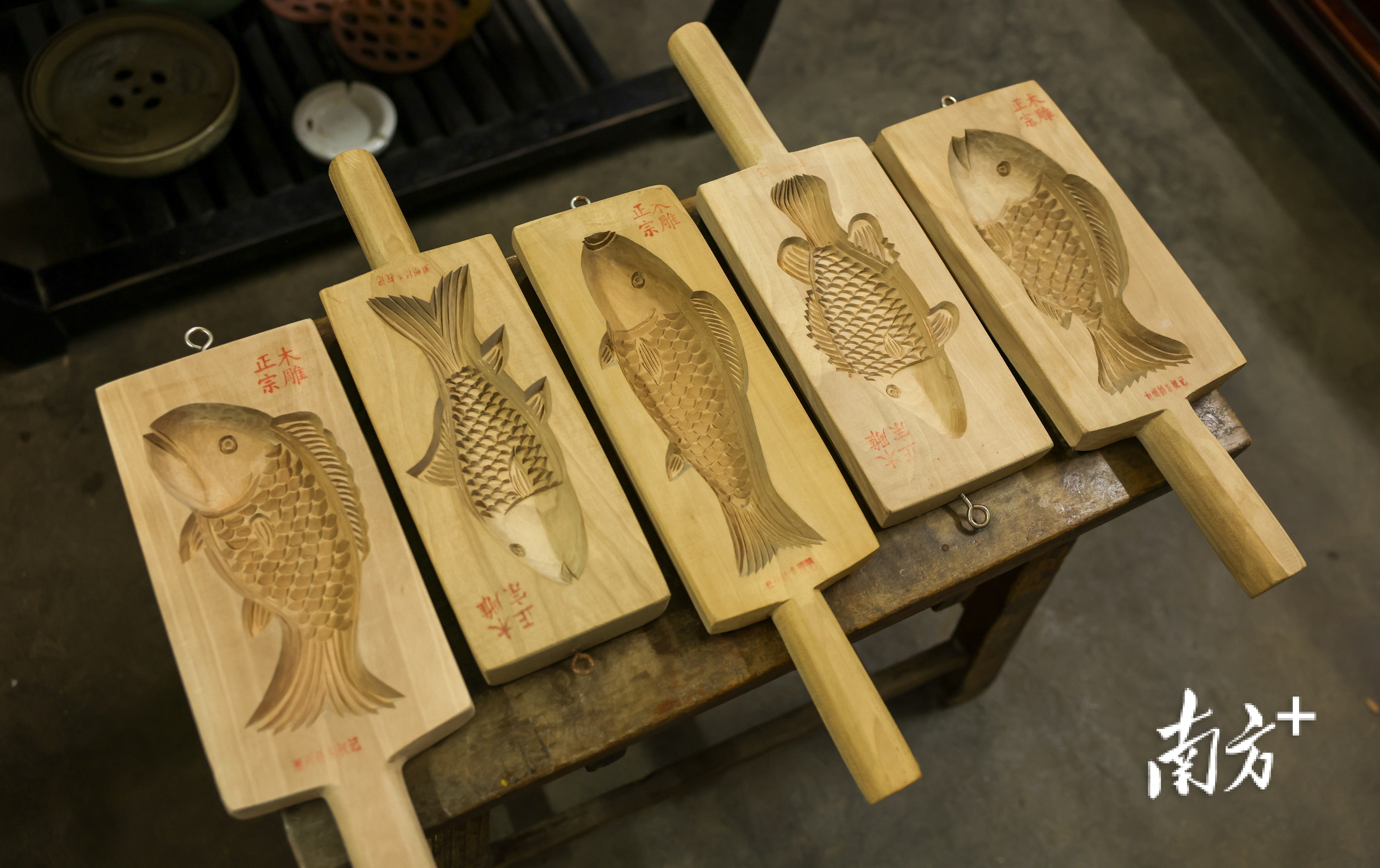 除了最常见的红桃粿印,潮汕地区其他糕、粿、饼印的丰富性超乎常人想象。许丽明的工作间墙上,揭阳的菊花糕印线条清瘦灵动,潮阳的大桃粿印浑厚饱满,泰国潮人定制的粿印上融合了斗鱼元素……“潮州人遍布海内外,不同地方有各自的习俗,这些都可以从他们定制的粿印里体现出来。”