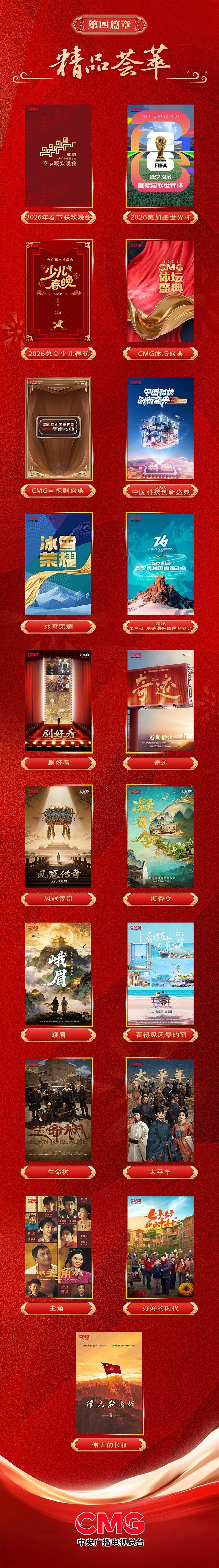 “精品荟萃”篇章中亮相的多部精品剧集备受观众瞩目,如总台首部原创精品短剧集《奇迹》展现深圳经济特区成立以来波澜壮阔的发展历程;《凤冠传奇》《凝香令》等系列文化微短剧以及《峨眉》《看得见风景的窗》等总台原创自制剧集,聚焦明代宫廷传奇、中医文化传承、守护峨眉山水和海岛诗意生活等主题。2026年,综合频道还将播出《生命树》《太平年》《主角》《好好的时代》《伟大的长征》等电视剧,以匠心打造的精品剧集,持续为观众带来高品质的观剧体验。