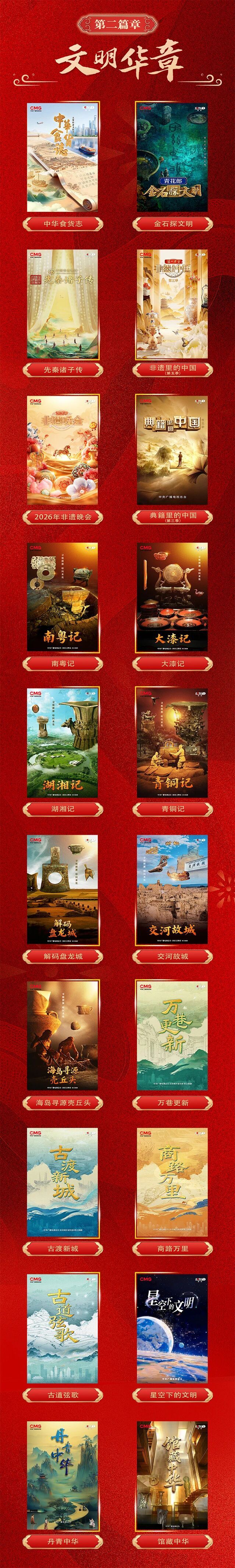 “美丽中国”篇章聚焦习近平生态文明思想,记录新时代生态文明建设辉煌成就,描绘人与自然和谐共生的美丽画卷。“精品荟萃”篇章汇聚总台电视剧、大型晚会、纪录片、重大赛事等各类节目,以满屏佳作彰显旗舰频道担当。