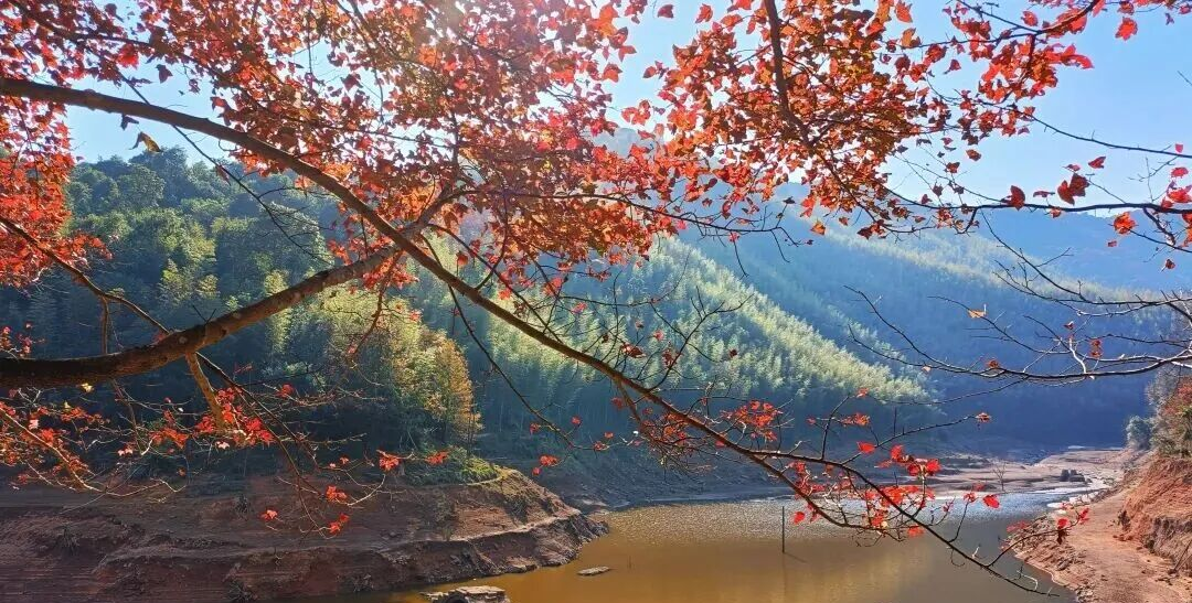 漫步岭头村湖畔,远山如黛、碧水含烟,群山环抱的碧水微波荡漾,沿岸的枫林如霞似火,层层叠叠的红韵倒映在波光潋滟的湖面,将整片山水晕染出温暖的底色,这样的风景美极了。
