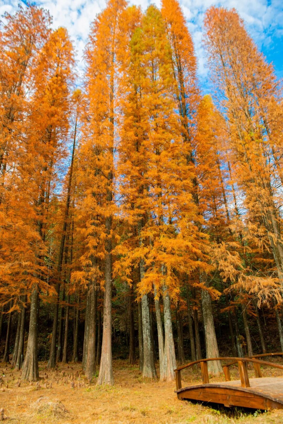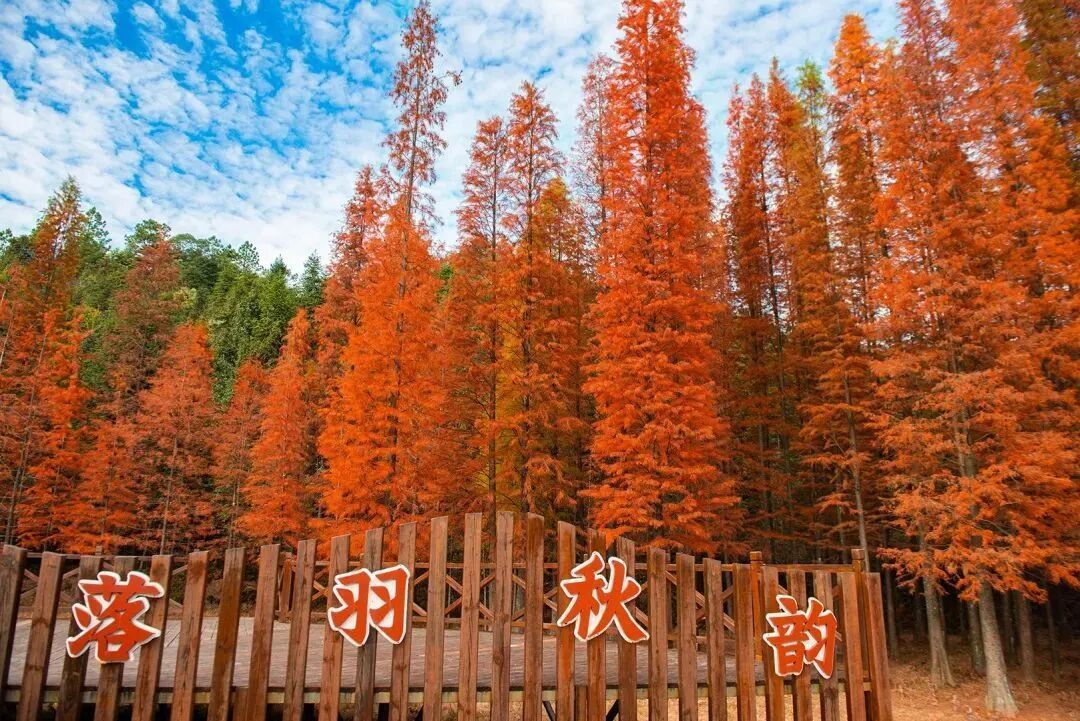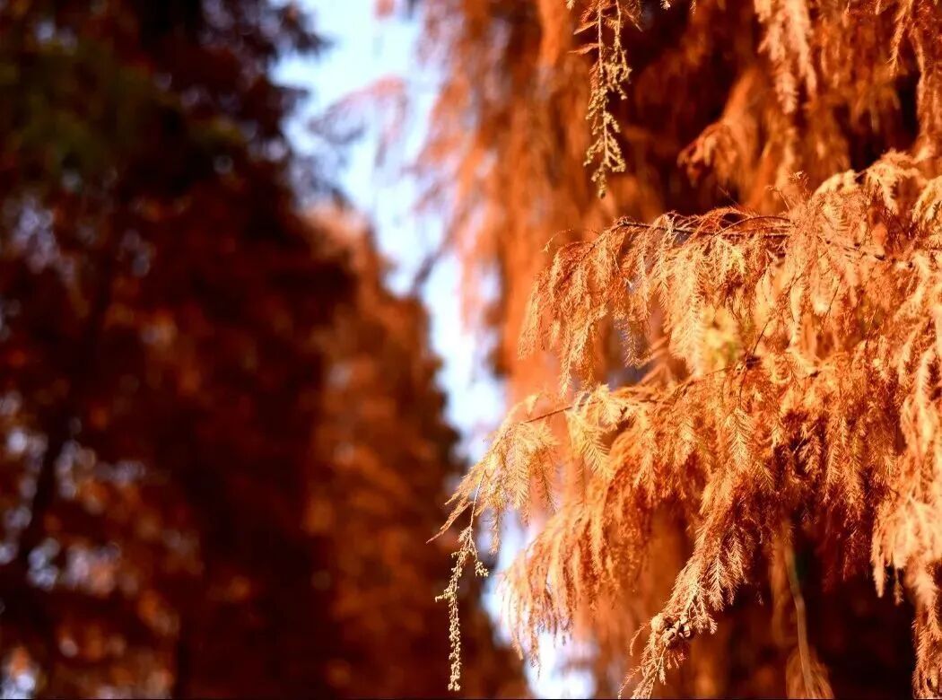 时下,这里的落羽杉已全红!阳光透过层层叠叠橙红色的叶片,在林间小径上投下斑驳光影,宛如行走在油画之中!