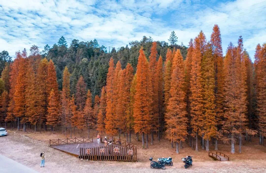 岭南红叶世界的美,不是零星点缀,而是万亩红枫林和落羽杉形成波澜壮阔的红色海洋。
