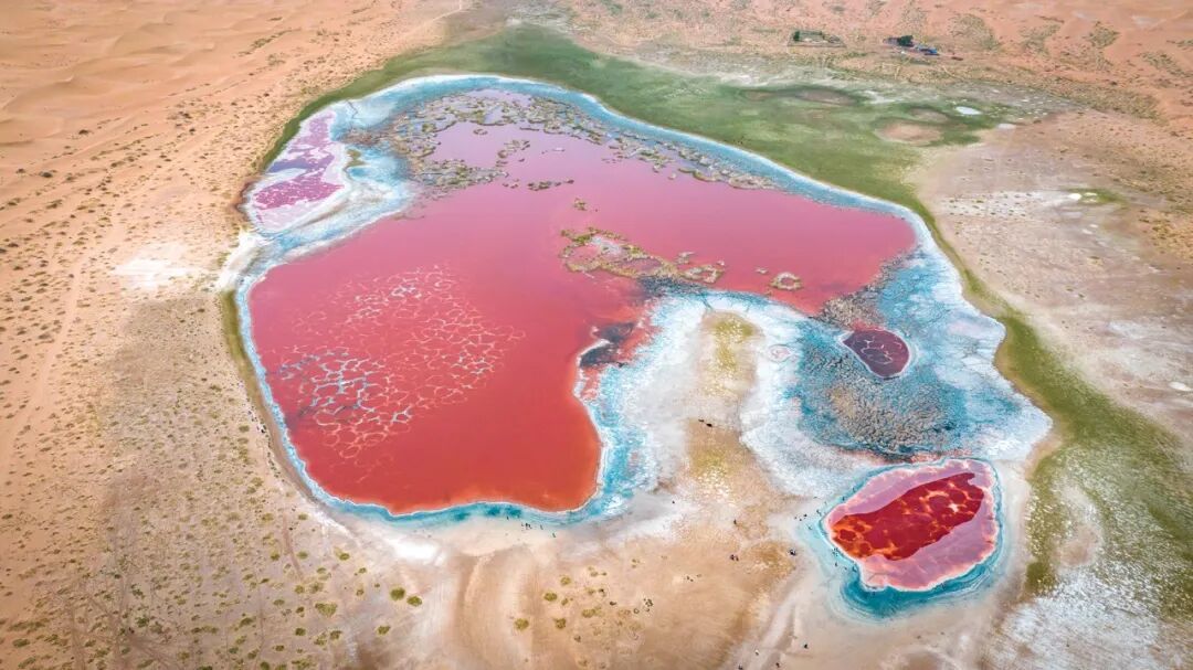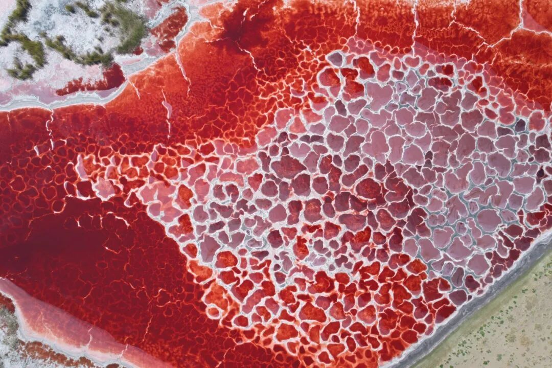 在不同的季节,随着气温、光照水量的变化,其生物量发生改变,湖泊颜色也会发生变化,嗜盐生物富集得多就会呈现深红色,富集得少则会呈现粉色或黄色。