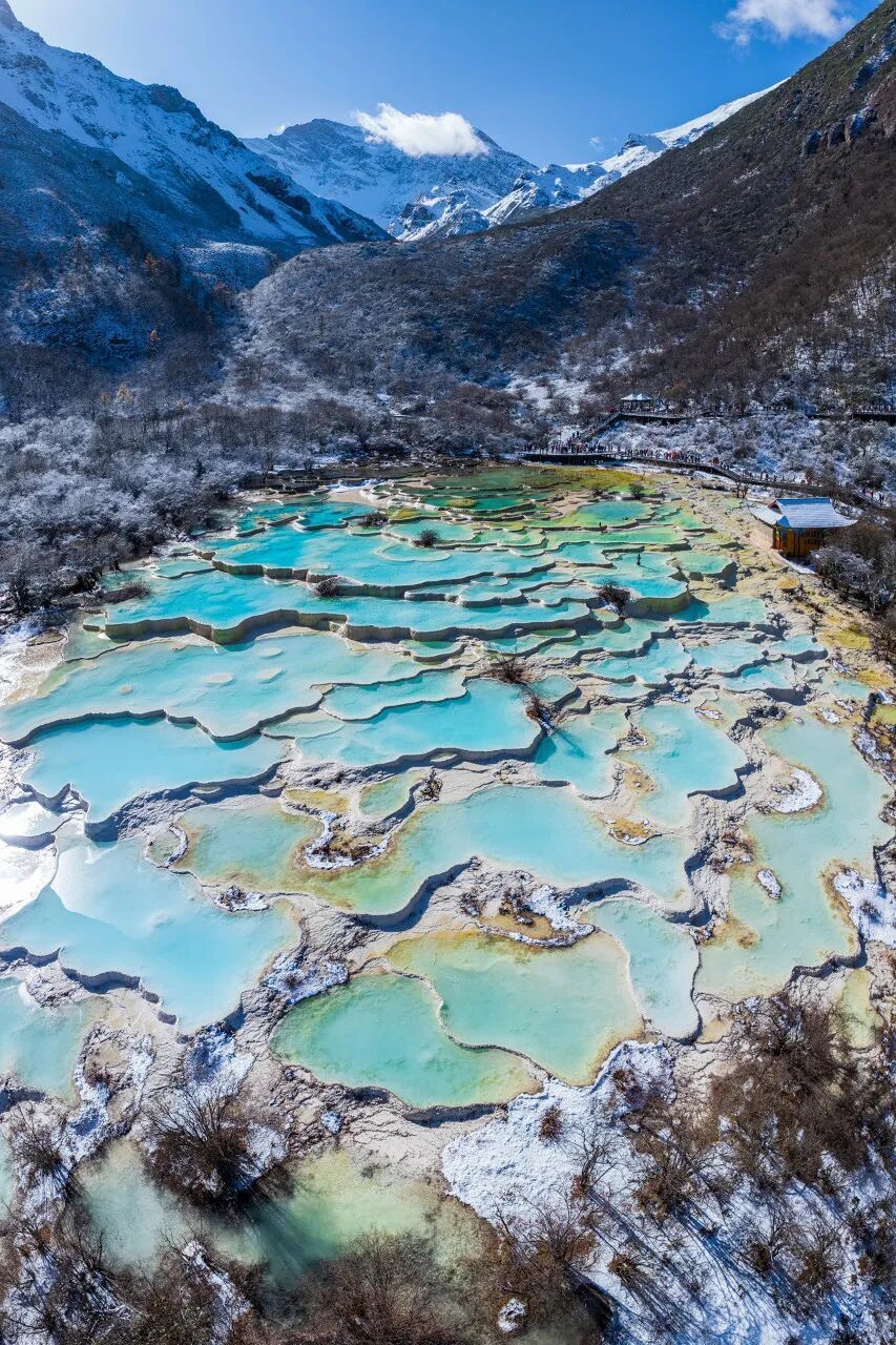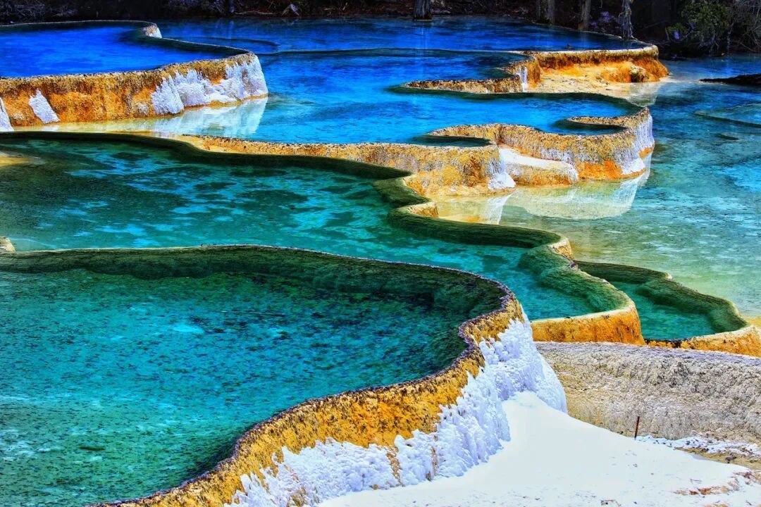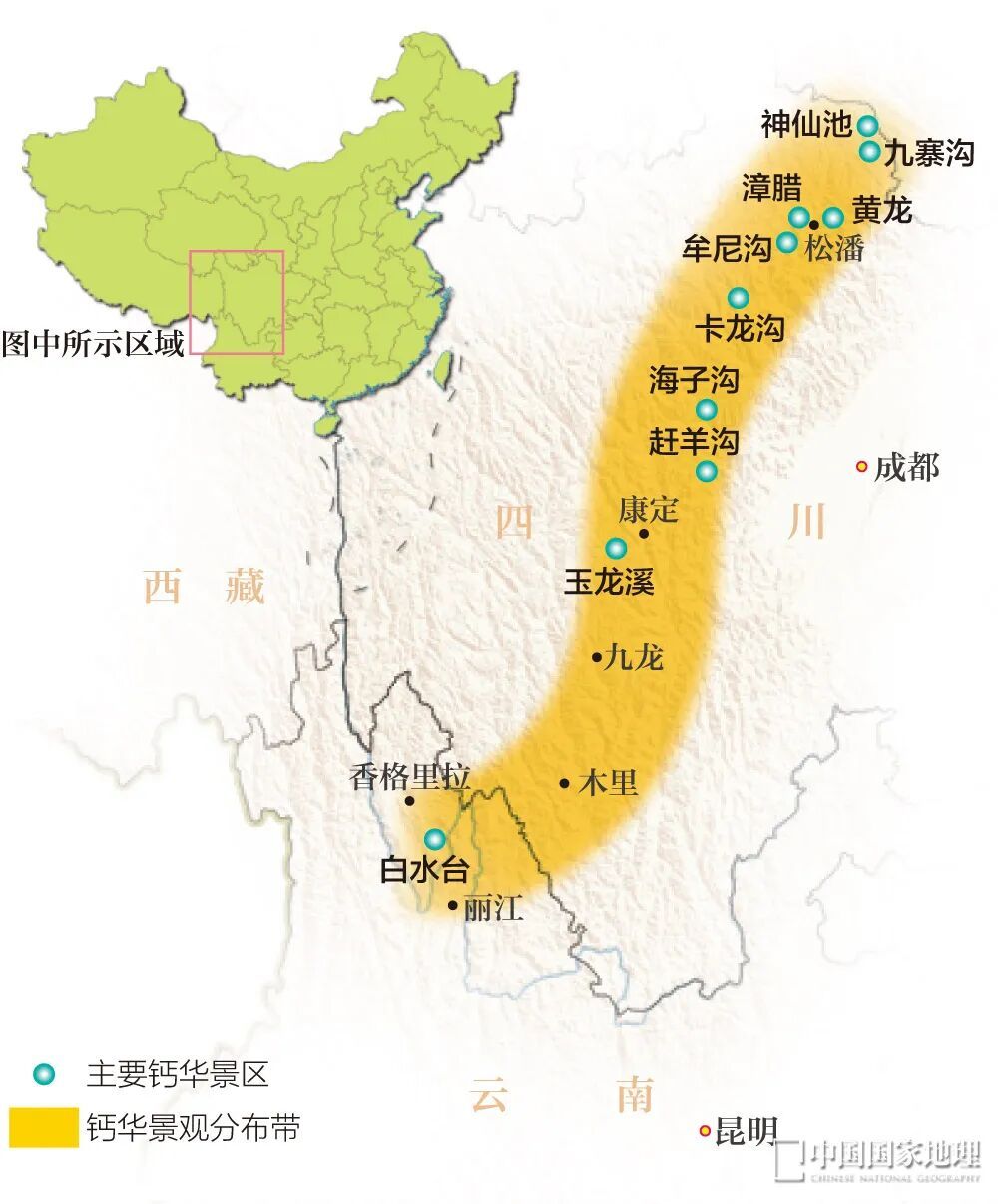 不仅是黄龙,在青藏高原东缘的高寒高山地区存在一个钙华风景带,范围南至云南香格里拉,北到四川西北部,长达数百公里。这个区域有着世界罕见的瑰丽奇美的钙华风景。