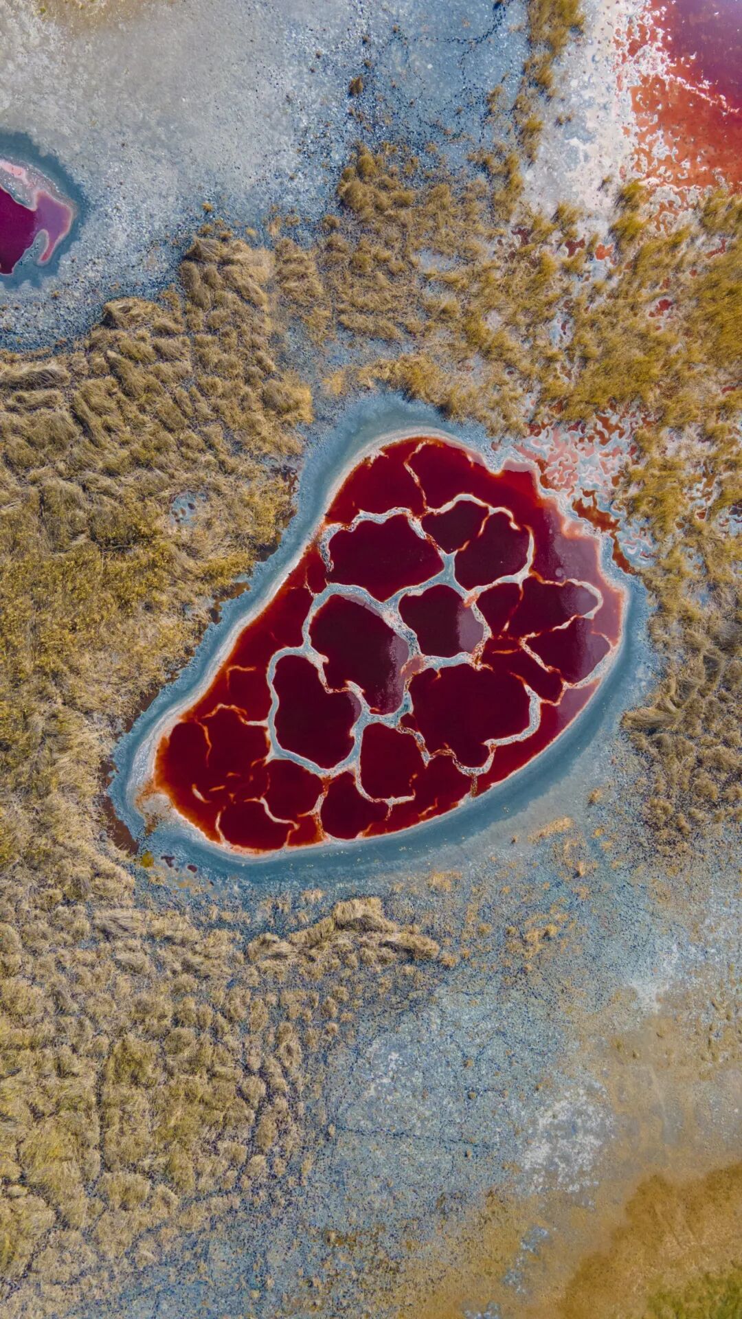 而血管状脉络的形成,与湖泊盐壳的运动密切相关。由于乌兰湖盐度极高,其表面结晶形成盐壳湖水结晶后体积膨胀,盐壳向外扩展,盐壳之间因此相互碰撞挤压,最终导致接触面断裂隆起,形成血管网结构。
