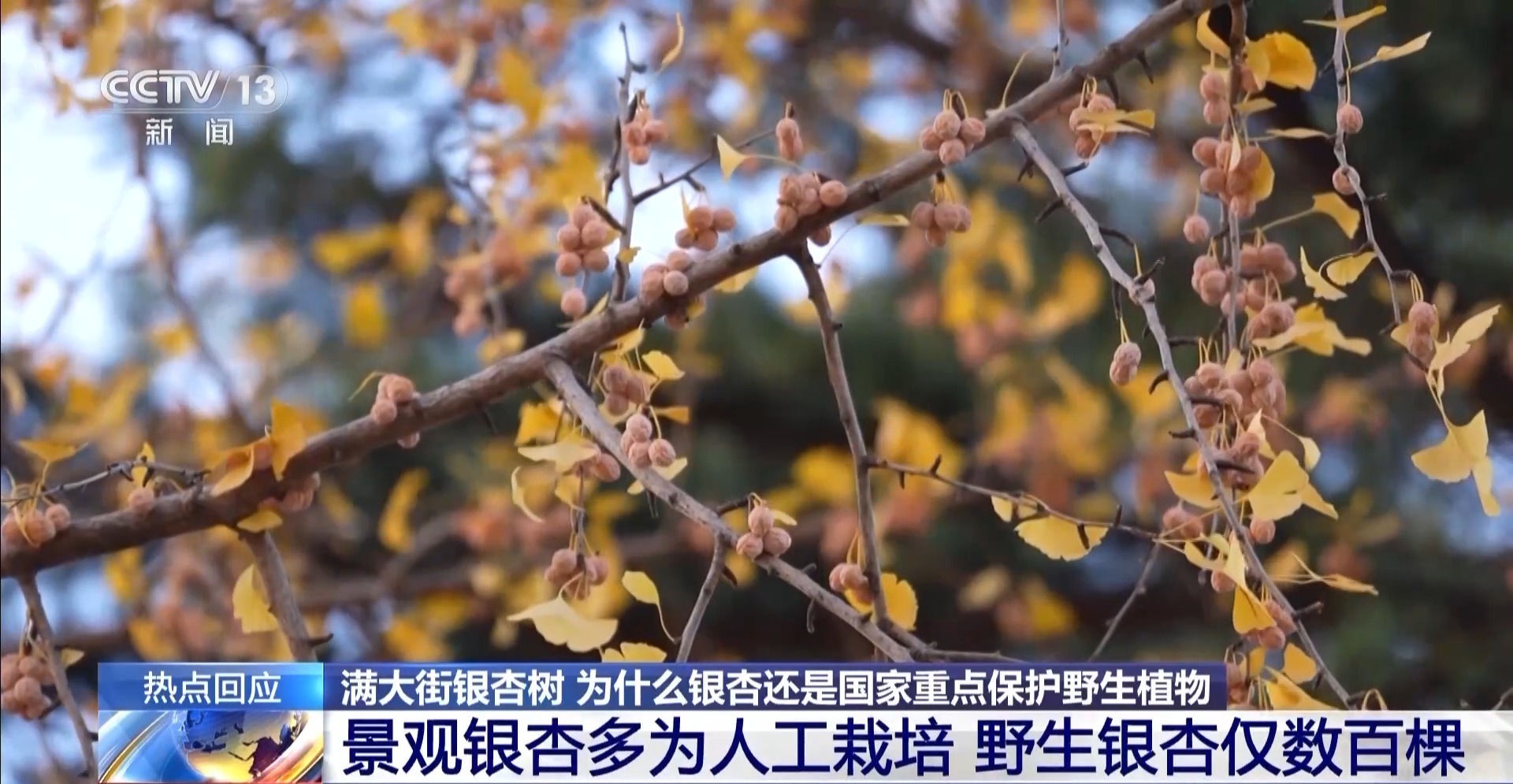 首都师范大学生命科学学院副教授 顾垒:野生的银杏种群在中国只有三个地方有,一个是在浙江的天目山,一个是在贵州的务川和重庆的金佛山交界的这一片,还有一个是在广东的南雄和广西的兴安交界的这一片,它们的野生种群的数量也非常少。