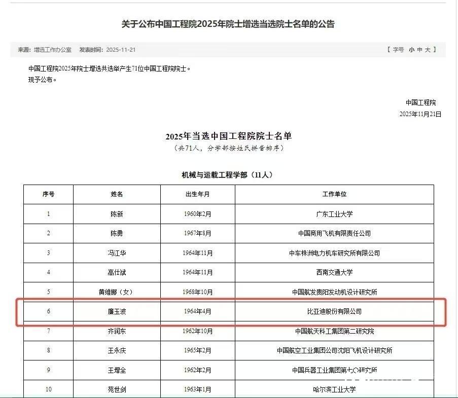 11月21日,中国工程院公布新当选院士名单,比亚迪(002594.SZ)首席科学家廉玉波成功当选。这位被誉为“比亚迪技术灵魂”的工程师,在61岁之际获得了中国工程科学技术领域的最高学术称号。