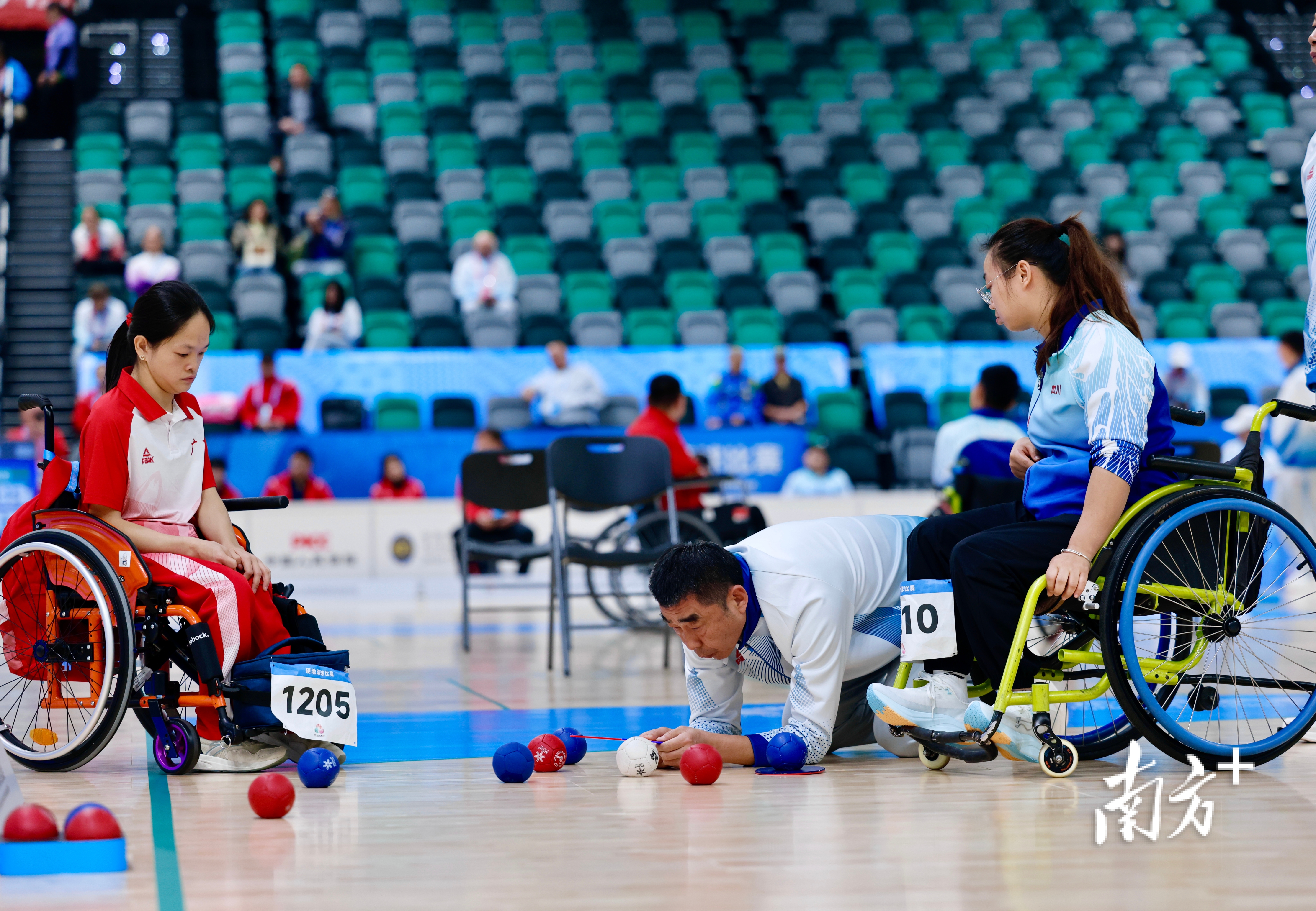 12月11日,残特奥会硬地滚球项目继续在香港启德体育园启德体艺馆举行。女子个人BC2级的第三名争夺战中,裁判仔细测量球体之间的距离。张由琼 摄