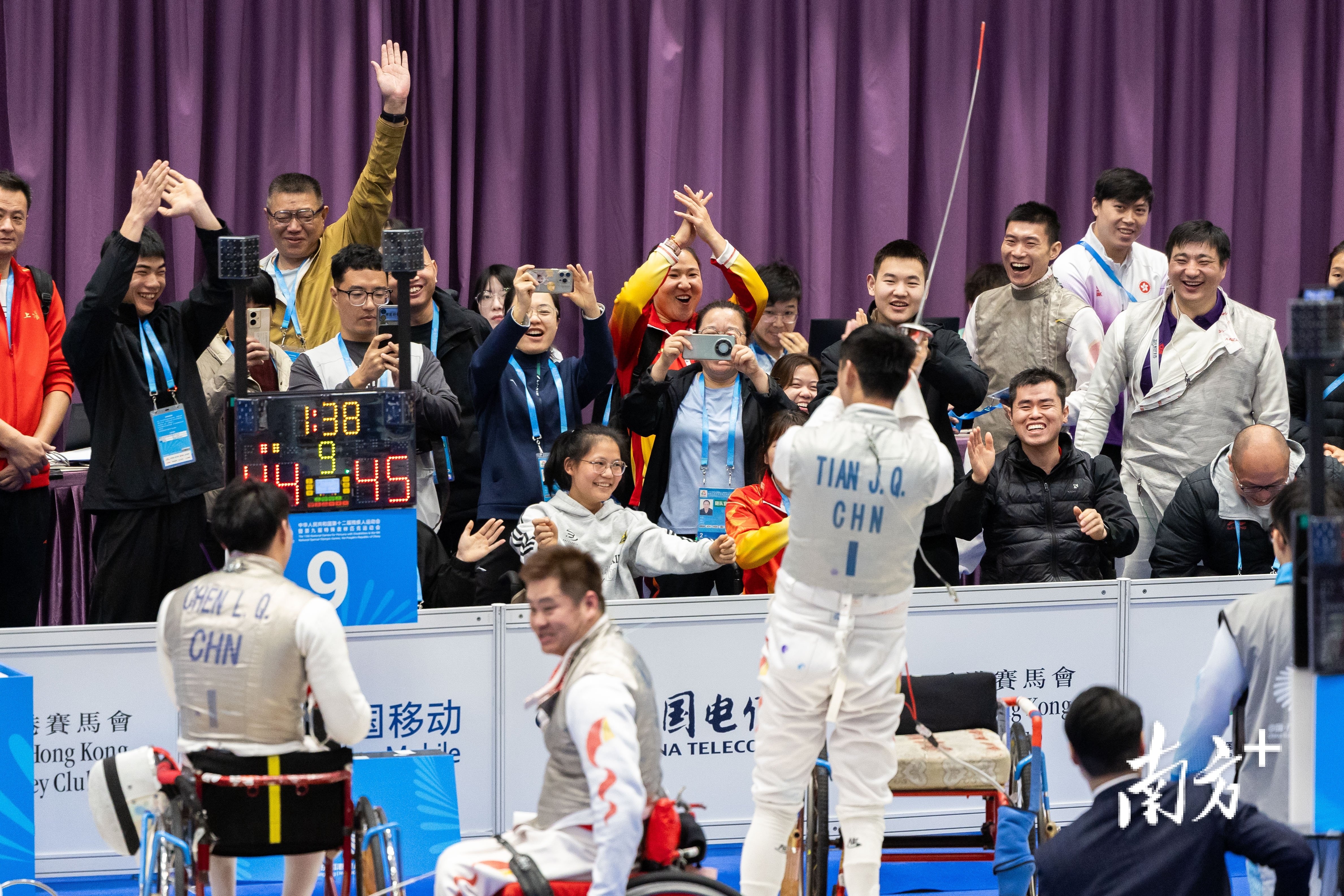 12月12日,在香港赛区的男子花剑团体半决赛中,江苏队险胜上海队,现场的工作人员为江苏队欢呼喝彩。苏韵桦 摄