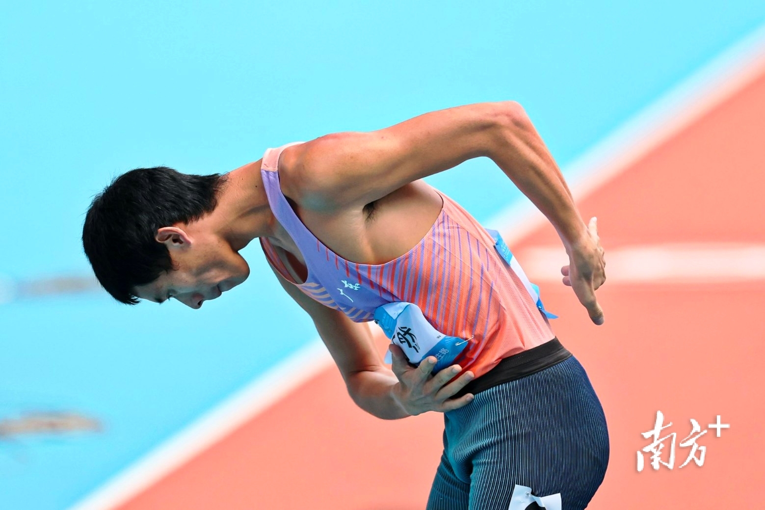 12月12日,残特奥会田径项目男子800米T36级决赛,广东选手丁然冲过终点后向鼓掌的观众们鞠躬致意,丁然获得银牌。郑新洽 摄