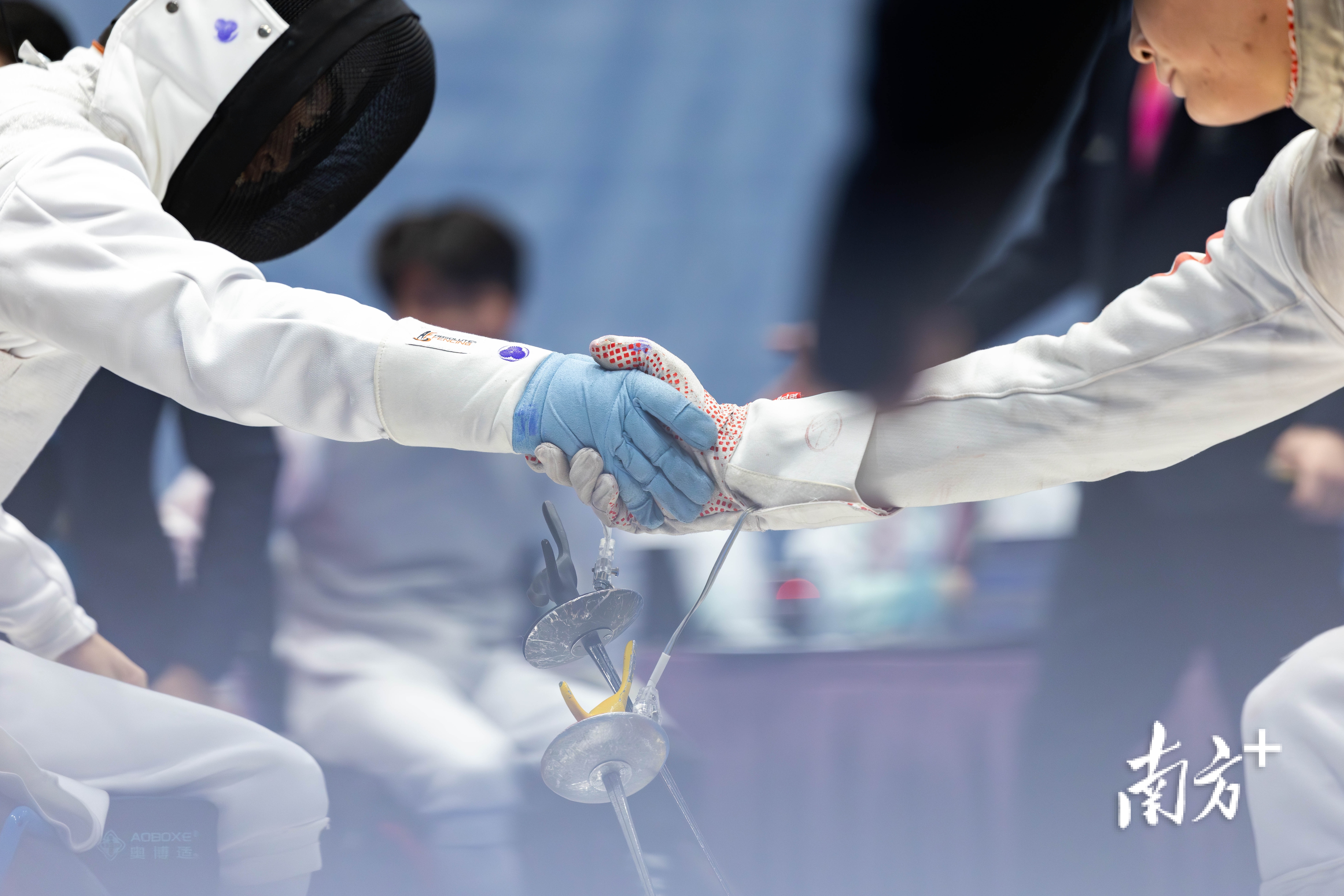 12月12日,在香港赛区男子花剑团体铜牌赛中,广东一团憾负上海队,赛后广东一团吴安迪与对手握手。苏韵桦 摄