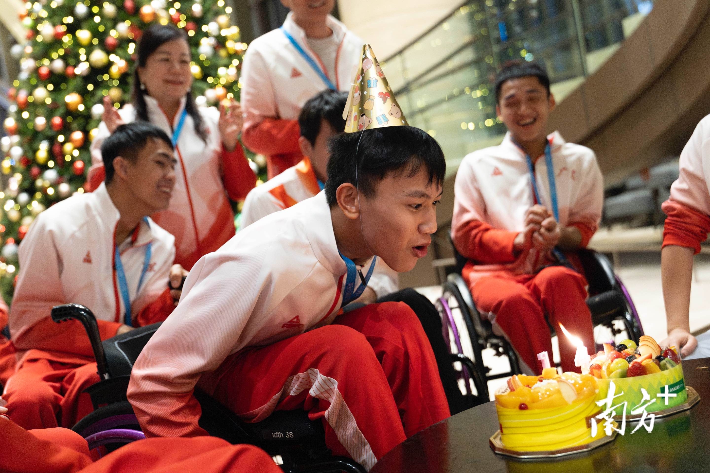 12月12日晚,结束第四个比赛日后,广东轮椅击剑队在下榻酒店一起为年龄最小的队员钟英杰庆祝14岁生日。梁钜聪 摄
