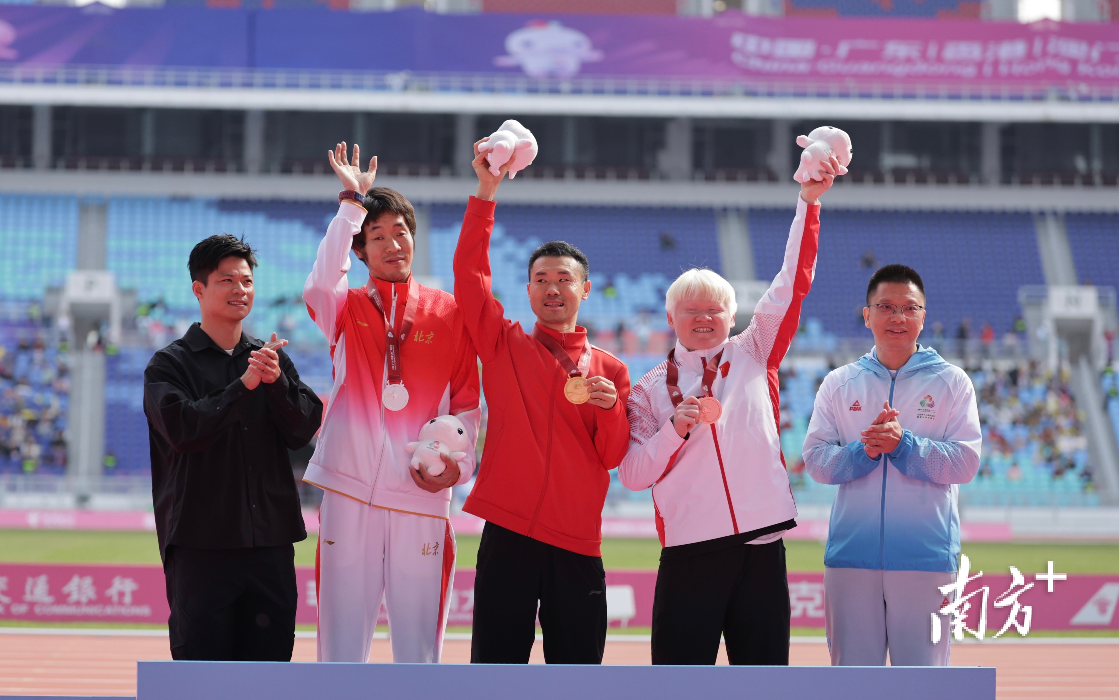 12月12日,苏炳添亮相广东奥林匹克中心体育场,为男子跳远T13级项目的获奖运动员颁奖。吴明 摄