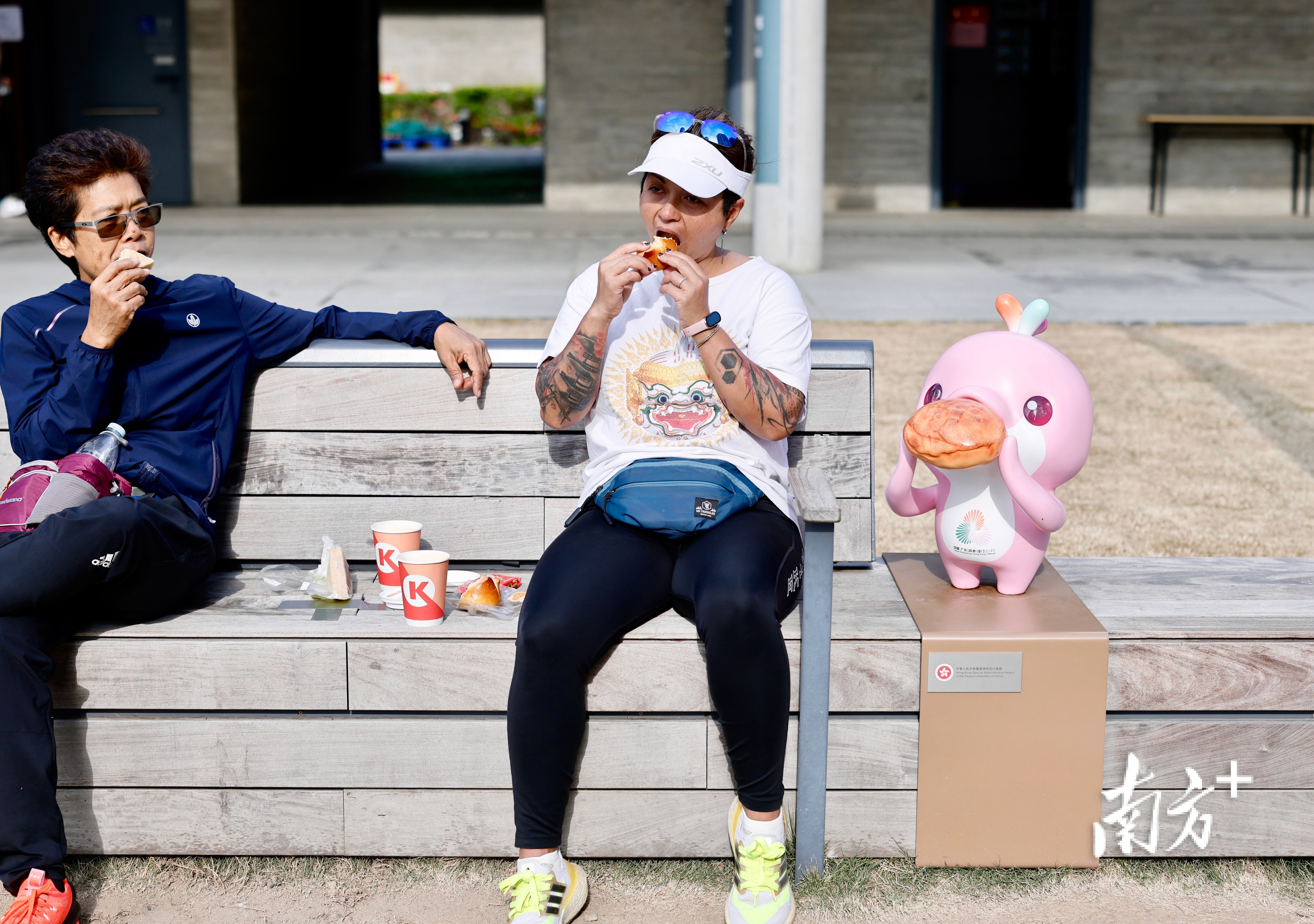 12月11日,香港启德体育园启德体艺馆外,两名外籍人士正在吃汉堡,和一旁同吃汉堡的吉祥物“乐融融”相映成趣。张由琼 摄