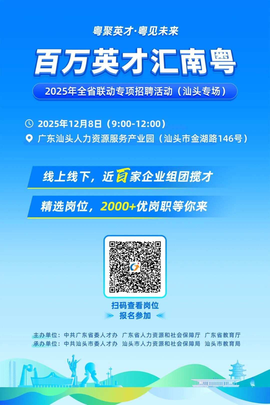 12月8日,“百万英才汇南粤”2025年全省联动专项招聘活动(汕头专场)将与全省联动同步举办,为省内外高校毕业生打造集中高效的招聘盛宴。