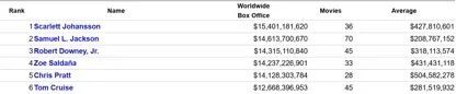 今年7月,据电影数据网站The Number的统计数据,阿汤哥成为全球票房最高的演员排行榜第6,仅次于“寡姐”斯嘉丽·约翰逊(Scarlett Johansson)、塞缪尔·L·杰克逊(Samuel L. Jackson)、小罗伯特·唐尼(Robert Downey Jr.)等经常出演漫威电影的好莱坞演员。