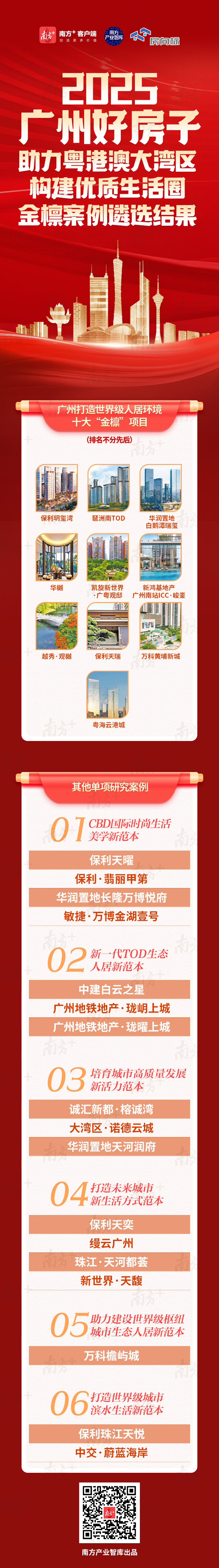2025年11月20日,南方产业智库正式发布2025广州好房子建设十大“金檩”项目和六大专项案例遴选结果。其中,保利玥玺湾、琶洲南TOD、华润置地白鹅潭瑞玺、华樾、凯旋新世界·广粤观邸、新鸿基地产广州南站ICC·峻銮、越秀·观樾、保利天瑞、万科黄埔新城、粤海云港城10个项目入选2025广州好房子建设十大“金檩”项目名单。在专项案例方面,保利天曜、保利·翡丽甲第、华润置地长隆万博悦府、敏捷·万博金湖壹号4个项目入选“CBD国际时尚生活美学新范本”,中建白云之星、广州地铁地产·珑岄上城、广州地铁地产·珑曜上城3个项目入选“新一代TOD生态人居新范本”,诚汇新都·榕诚湾、大湾区·诺德云城、华润置地天河润府3个项目入选“培育城市高质量发展新活力范本”,保利天奕、缦云广州、珠江·天河都荟、新世界·天馥4个项目入选“打造未来城市新生活方式范本”,万科檐屿城入选“助力建设世界级枢纽城市生态人居新范本”,保利珠江天悦、中交·蔚蓝海岸入选“打造世界级城市滨水生活新范本”。