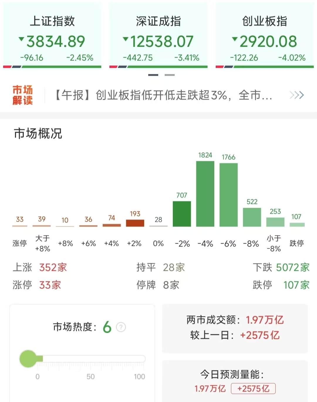 全市场5072只个股下跌,99只跌停;354只个股上涨,33只涨停。市场放量下跌,两市成交额1.97万亿元,比上一日增加2575亿元。
