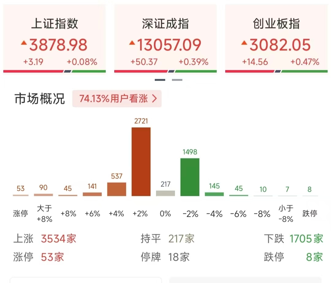 12月5日,A股三大指数开盘涨跌不一,此后探底回升。截至午盘,三大股指齐上涨。沪指报3878.98,微涨0.08%;深成指涨0.39%,创业板指涨0.47%。全市场3500多股飘红,1700多股下跌,半日成交额近万亿元。