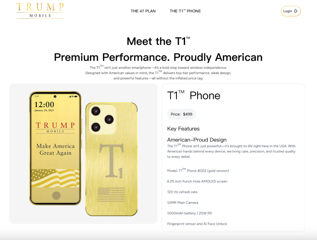 土豪金的外壳、星条旗标志、开机就是“让美国再次伟大”(MAGA)的壁纸,这款名为T1的智能手机设计上充满了特朗普元素。