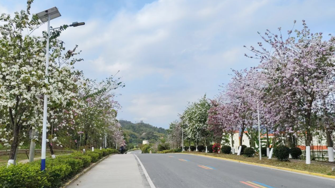 踏入蓝钟镇,首先映入眼帘的是圩镇入口的美丽廊道。道路两旁,林木青翠,繁花似锦,粉紫相间的羊蹄甲交织摇曳,在春风里竞相绽放,满目生机。