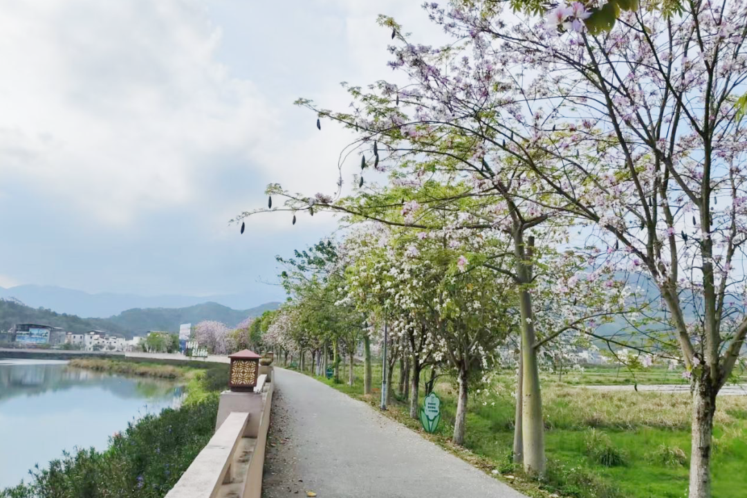 行至绿道,一江碧水缓缓流淌,岸边黄花风铃木与宫粉紫荆次第盛开,绘就一道靓丽风景线。微风轻拂,花瓣轻落,空气中弥漫着淡淡花香,沁人心脾。