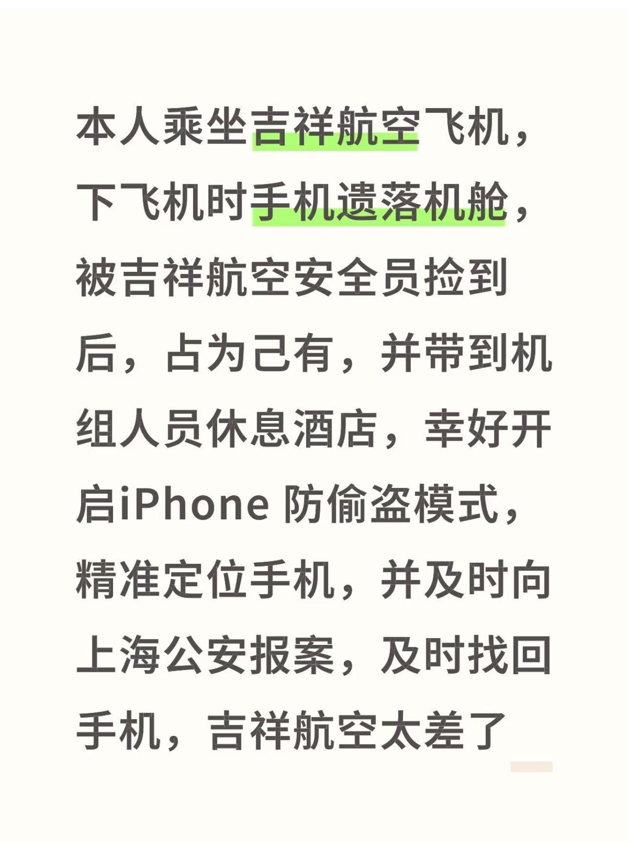 网友发文。据了解,该网友表示,在9月14日吉祥航空HO1659航班上,遗落机舱的手机被航空安全员捡到后非法侵占。随后该网友打开手机防盗功能,发现手机定位在布鲁塞尔唐拉雅秀酒店,该网友称,“这是吉祥航空机组人员休息酒店。”