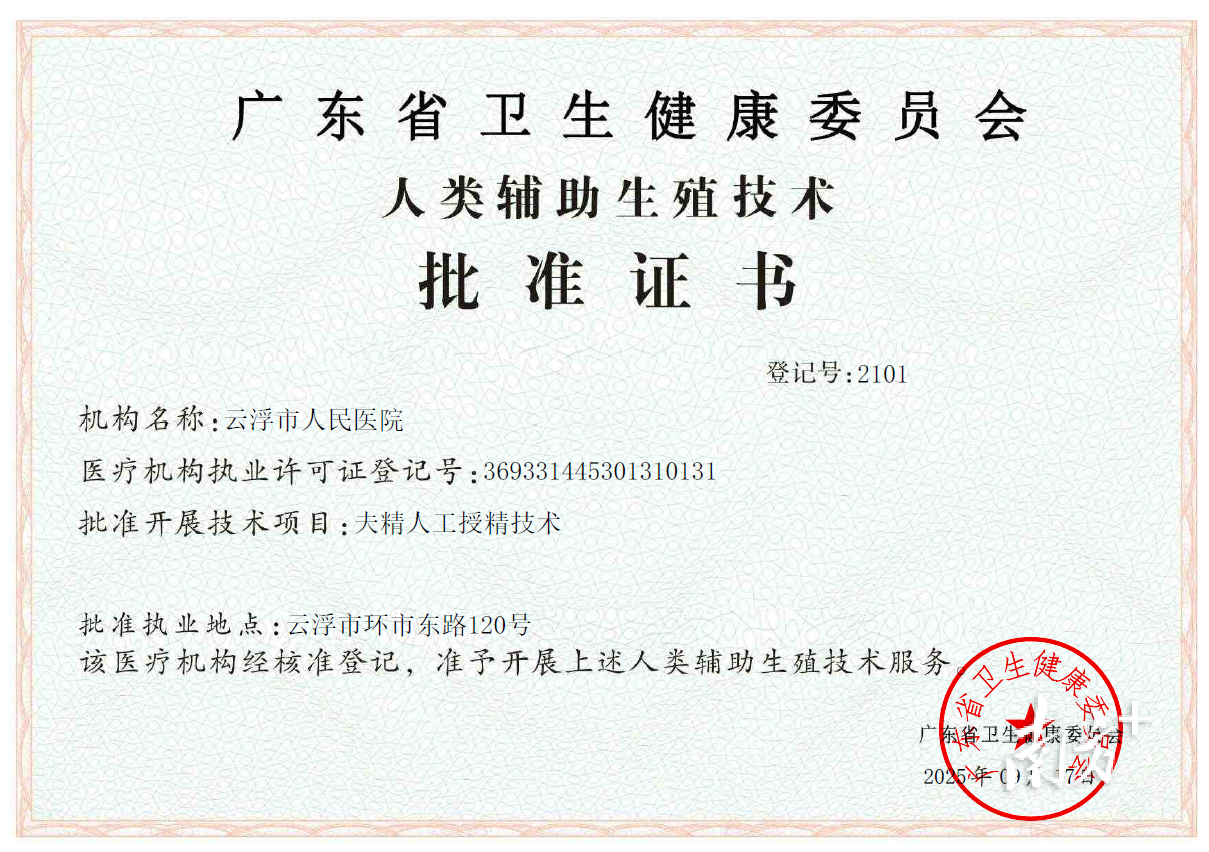 近日,云浮市人民医院生殖医学中心通过一年试运行评估,正式获得广东省卫健委颁发的人类辅助生殖技术(夫精人工授精)批准证书。这标志着该院在辅助生殖技术领域取得重要突破,为后续开展更多类型的辅助生殖技术奠定了坚实基础。