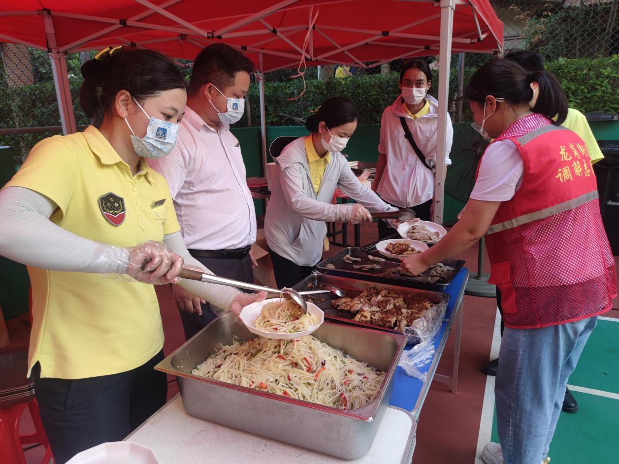 活动现场设在千林山居二期篮球场,棕榈掩映之下,15桌佳肴依次排开,吸引200余位居民热情参与。红色主题背景板前,圆桌上茶点丰盛,居民们纷纷端出拿手好菜:白切鸡、柠檬凤爪、萝卜牛腩、农家腊肉……天南地北的家乡味,在邻里笑语中汇成一道温情盛宴。
