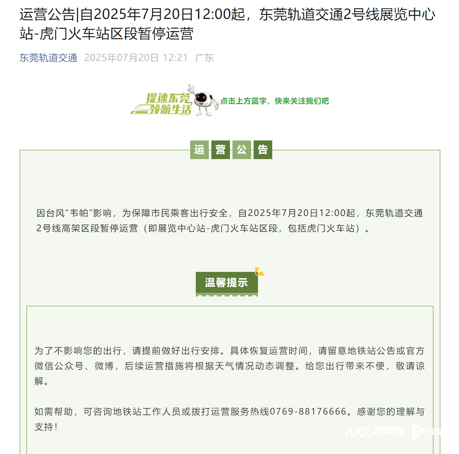 据东莞轨道交通消息,自2025年7月20日12:00起,东莞轨道交通2号线高架区段暂停运营(即展览中心站-虎门火车站区段,包括虎门火车站)。具体恢复运营时间,请市民旅客留意地铁站公告或官方微信公众号、微博,后续运营措施将根据天气情况动态调整。