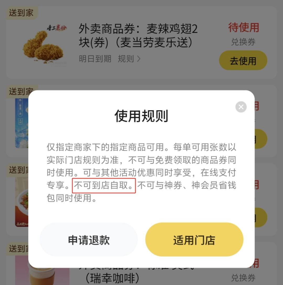 但同样有网友发现,一些0.01抢到的券只能外卖,不仅要凑配送费,而且还有较高的起送门槛。