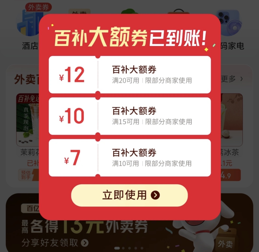 延续上周末的外卖狂欢,昨日,美团、淘宝闪购等平台再次分别发放外卖大额券,有网友一大早就晒出“零元购”的瑞幸咖啡:“已经喝上了,早起的鸟儿有虫吃。”