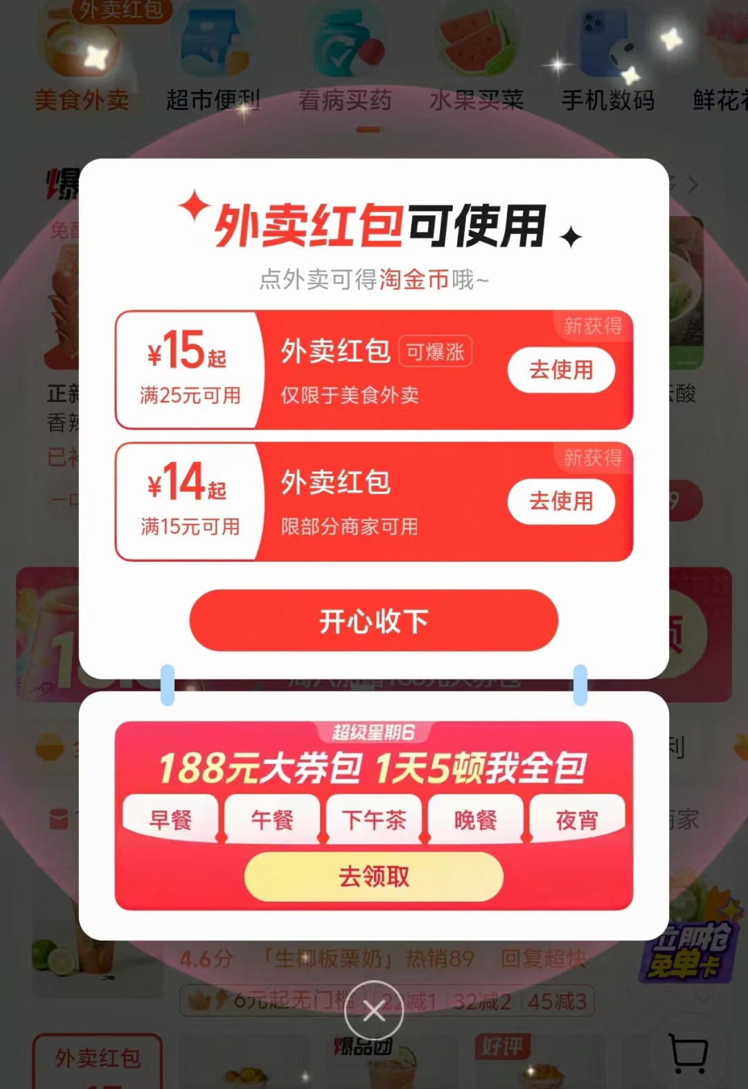 如今阿里试图再造一个全民参与的促销节日“超级星期六”:在未来100天内,消费者在每个周六都可以获得总额为188元外卖消费红包(红包总额度会根据每期活动有变化),消费者用红包支付后可以买到超低价奶茶咖啡和快消速食。