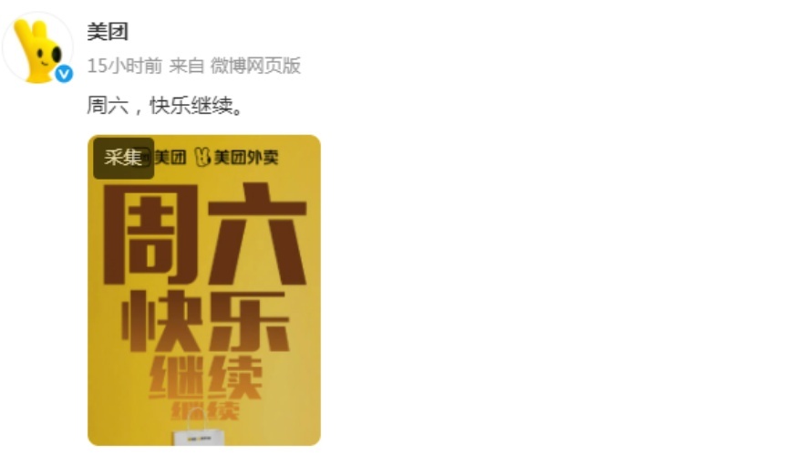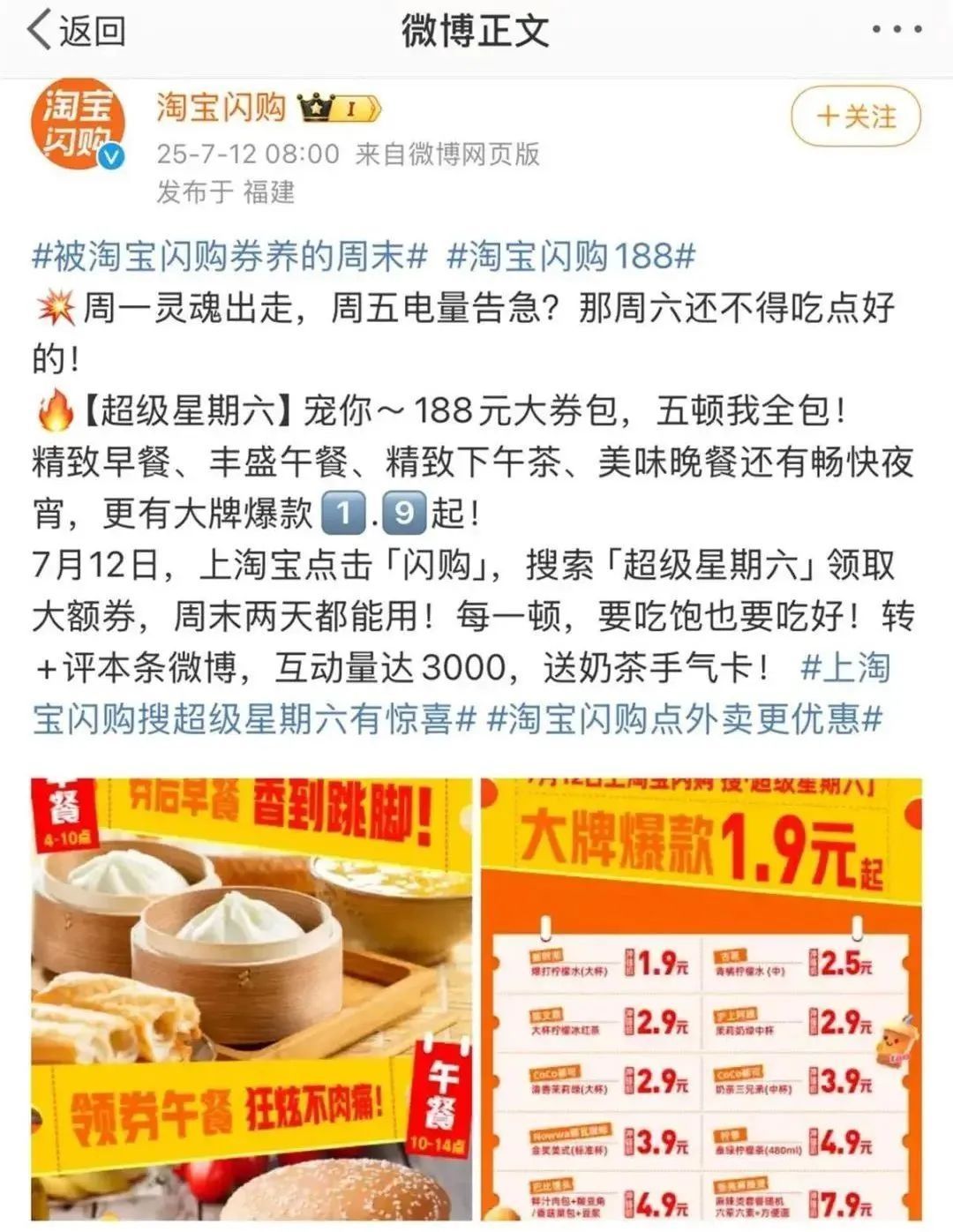 早在7月11日晚,美团官方就发布了“周六,快乐继续”的微博,预告本周末的外卖狂欢。7月12日一早,淘宝闪购官方也在微博宣布“周六吃点好的,‘超级星期六’188元大券包,五顿我全包”。