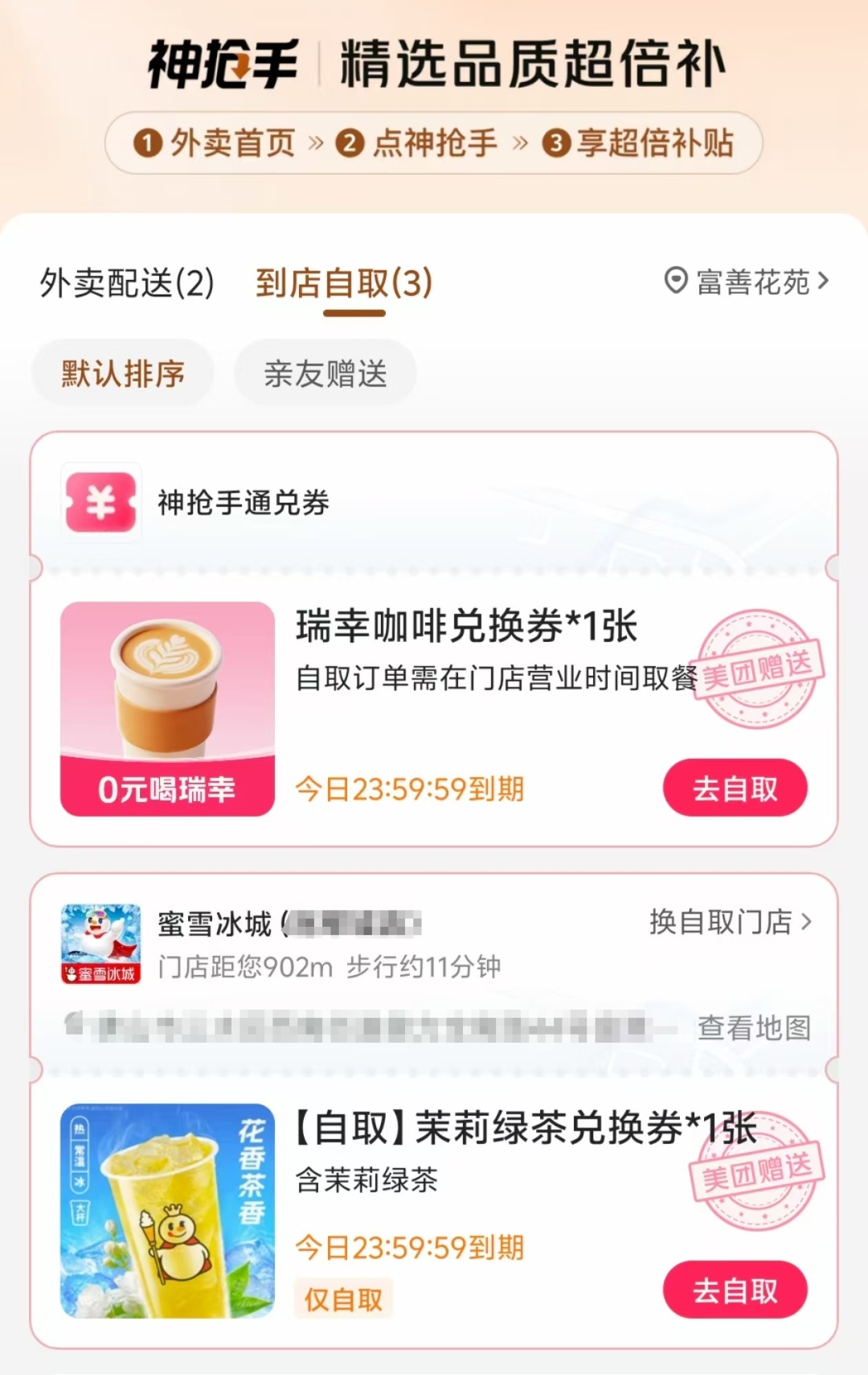 打开美团,随即收到“0元外卖已到账”的弹窗。点开即可领取了0元喝饮品、0元喝瑞幸、古茗鲜活柠檬水兑换券3张到店自取优惠券,以及瑞幸咖啡兑换券、早餐兑换券两张外卖优惠券。