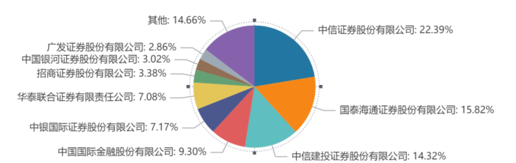 据wind数据,上半年,股权承销金额前五的均为头部券商,合计承销金额占比达69%。其中,三家承销金额超千亿元,包括中信证券承销1619.3亿元,行业第一;年初国泰君安吸收合并海通证券后,改名国泰海通,上半年股权承销1144.8亿元,排名跃升至第二;中信建投承销1036.2亿元,排名第三。